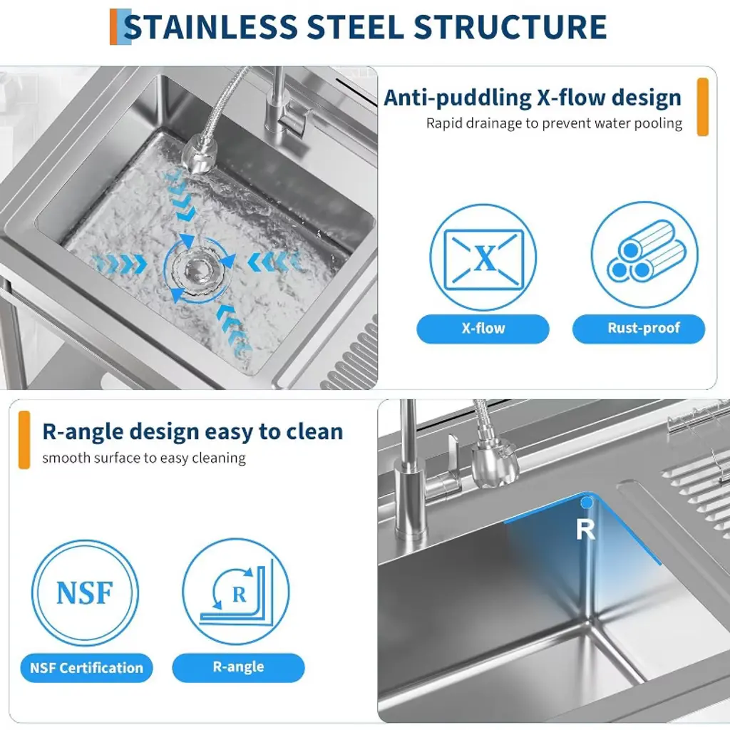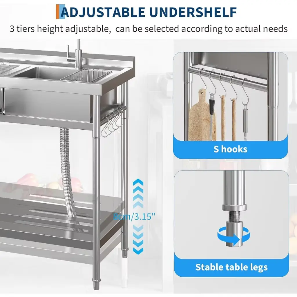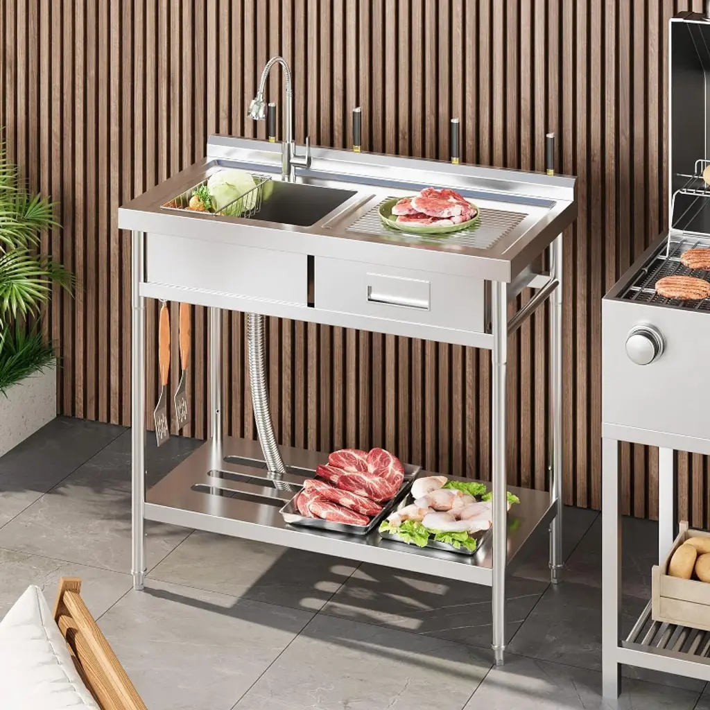 Commercial Stainless Steel Utility Sink, Freestanding Single Bowl Kitchen Sink With Cold & Hot Water Faucet, Built-in Wash Board, Drawer