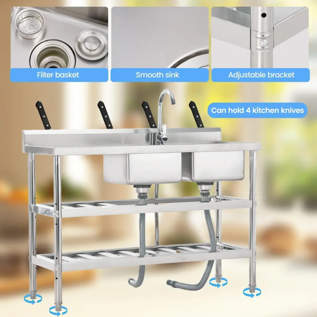 Commercial Utility Sink, Freestanding Double Bowl Kitchen Sink Set with Cold and Hot Water Pipe, Workbench, Undershelf for Restaurant, Garage, Outdoor