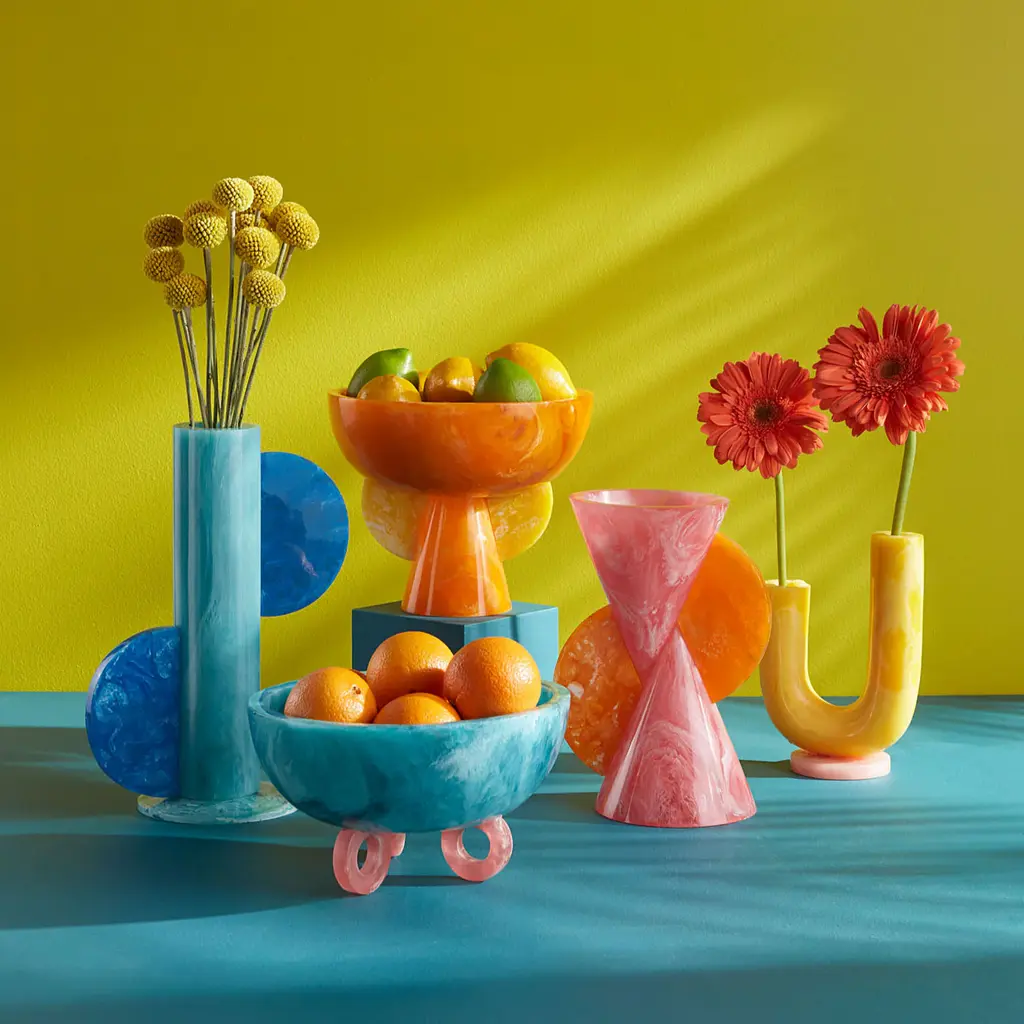 Translucent Treats. Our mesmerizing Como collection pairs juicy, dimensional color with bold, Memphis-y geometrics. Hand-poured to create a unique marbleized finish, each piece is then polished to luminous perfection. Featuring swirling poppy tones, our pedestal bowl brings one-of-a-kind shine to any modern tablescape, and even more monumental when it’s styled with the rest of our Como collection.