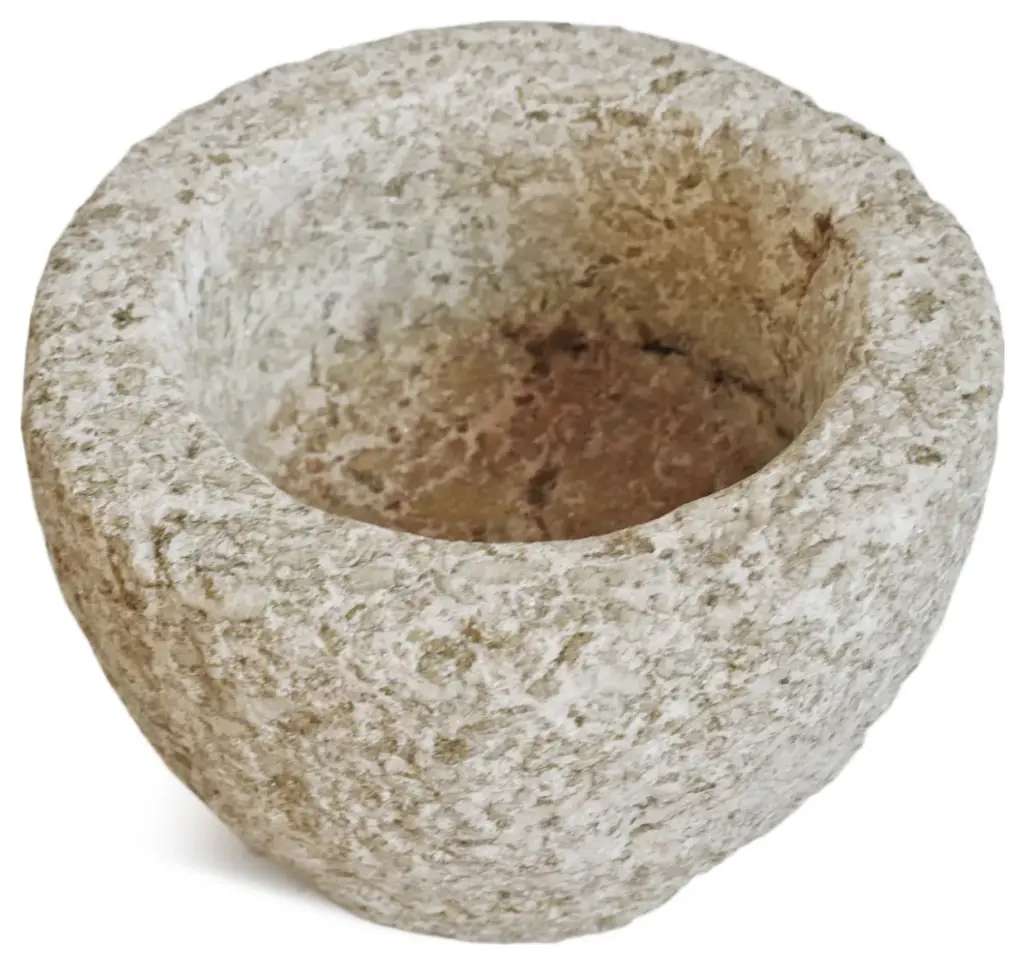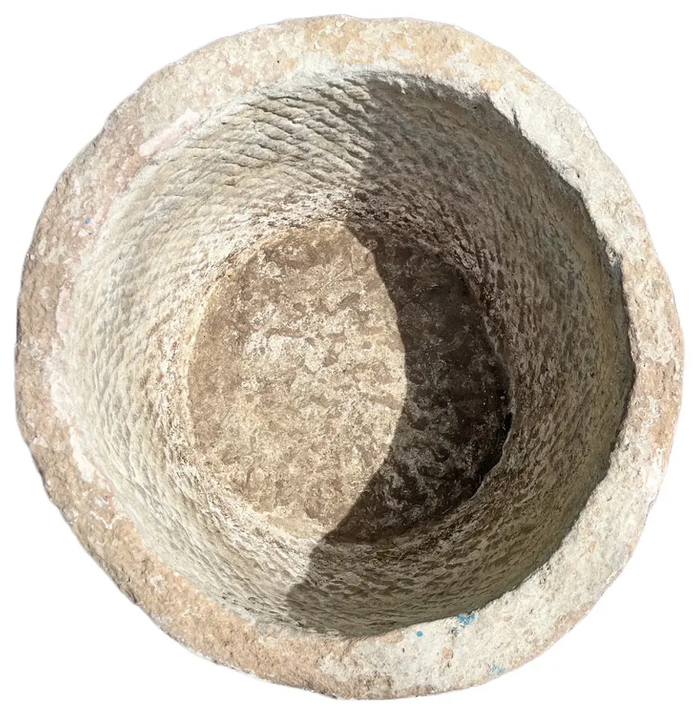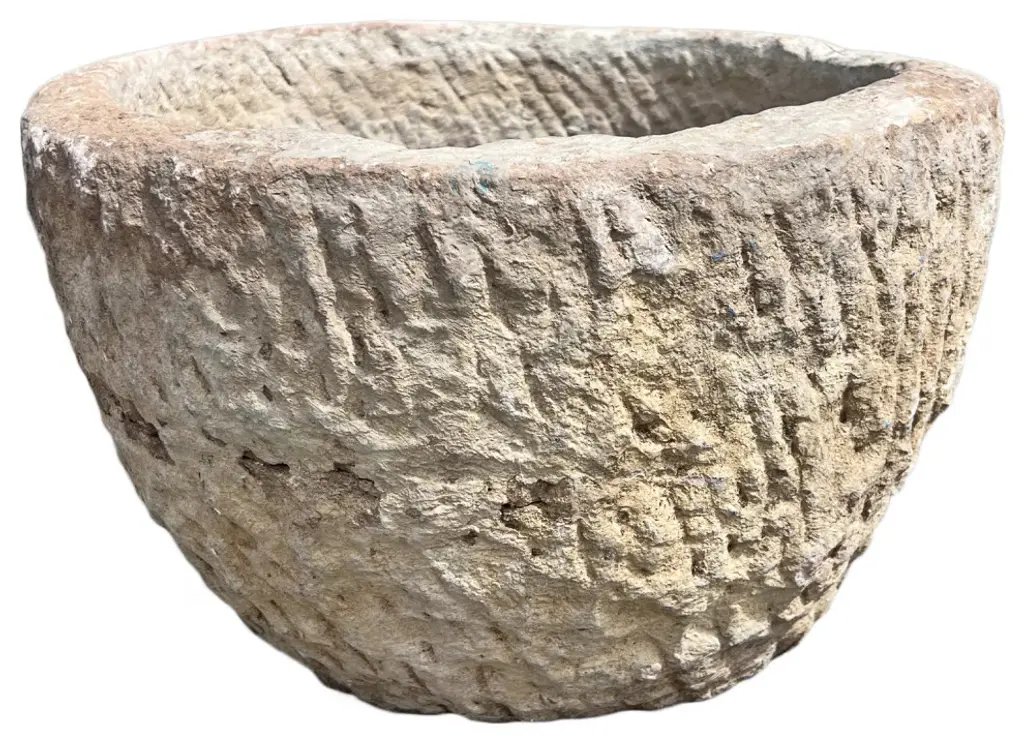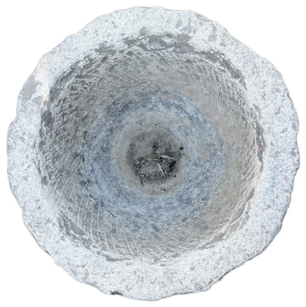 Consigned old solid stone large round bowl from India. Rustic rough texture. Wonderful for outdoor or indoor use / display.Condition: Great, with signs of age and useOrigin: IndiaEra: Mid 1900''s