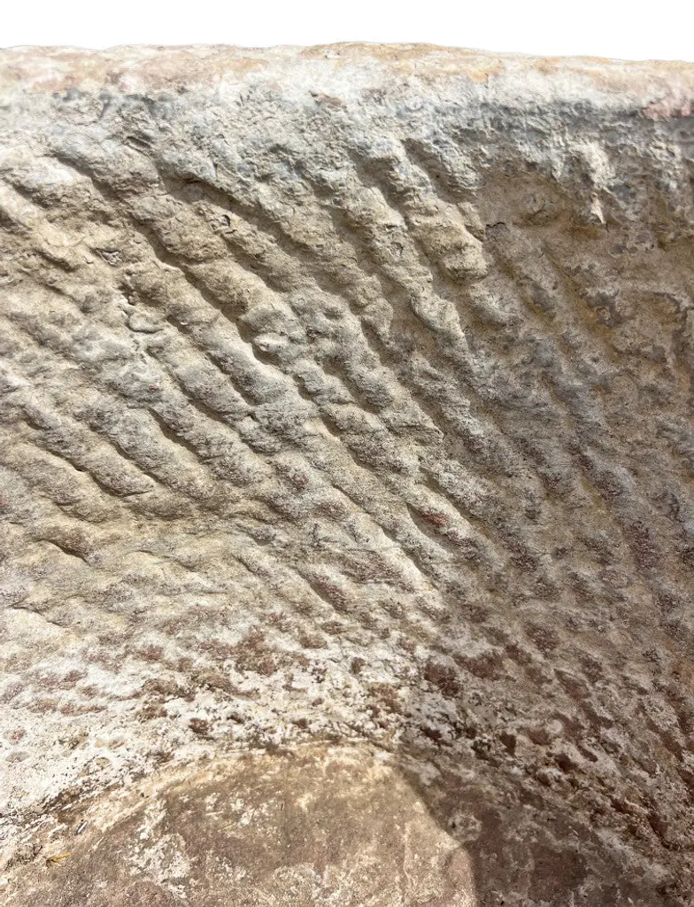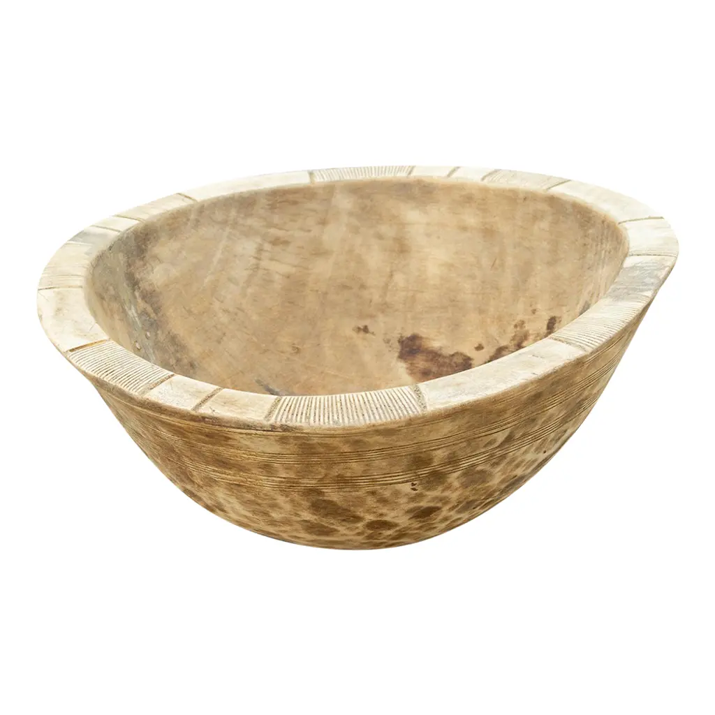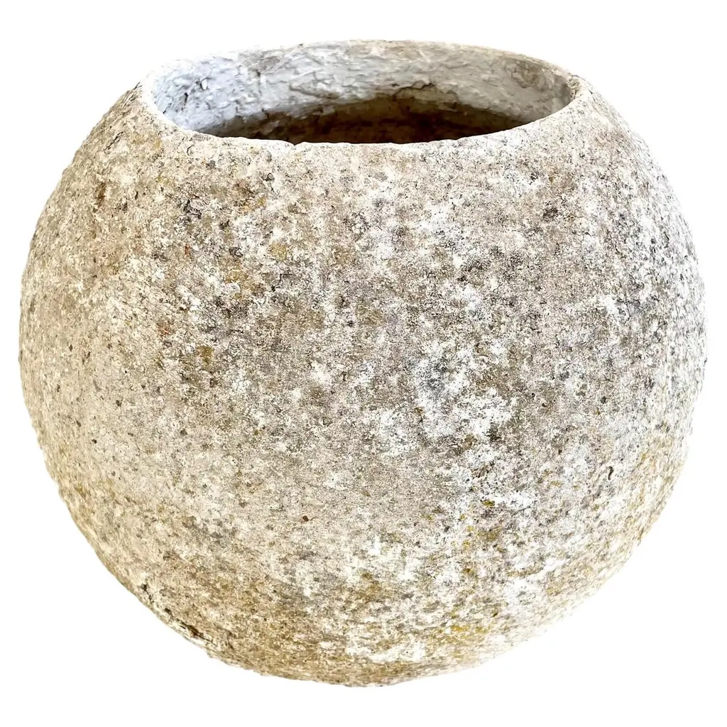 Consigned old solid stone large round bowl from India. Rustic rough texture. Wonderful for outdoor or indoor use / display.Condition: Great, with signs of age and useOrigin: IndiaEra: Mid 1900''s