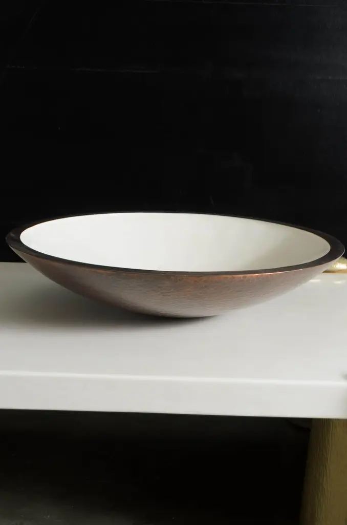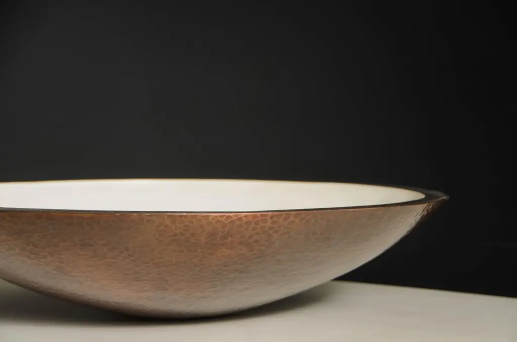 Shallow Bowl cream Exterior Copper exteriorCream LacquerAntique copper Hand repousséLimited EditionContemporaryRepoussé is the traditional art of hand-hammering decorative relief onto sheet metal. This technique involves using a hammer and various shaping tools. The lacquer part is made with at least 60 coats of organic lacquer. Each layer of lacquer is applied with a curing period of 24 hours in between so that it can dry. Each piece is individually crafted and is unique.