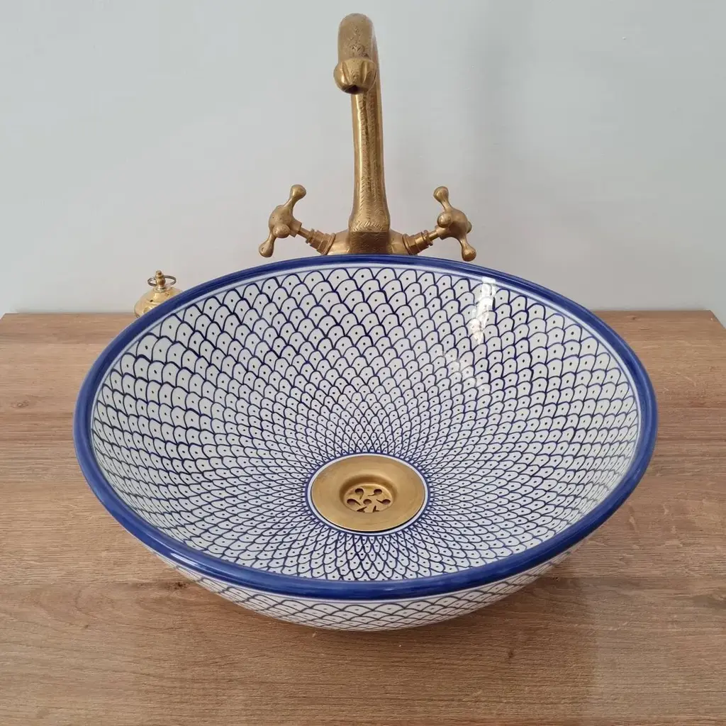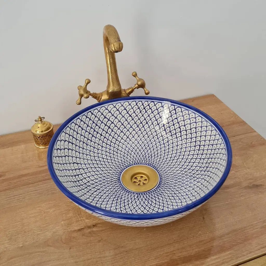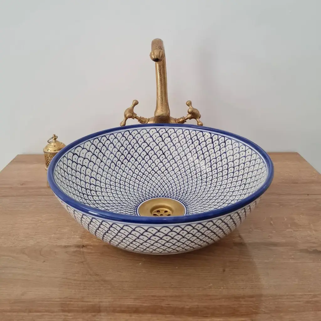 ZERKA' Blue Sink Bowl, finished basin features the delicate pale Blue colour and crackle glaze finish often seen in traditional Moroccan ware. It’s a great way to introduce a simple, pretty, decorative element to bathrooms or cloakrooms and works equally well with modern or traditional brassware. Brass faucet not included. Essahly' appreciate Your Visit