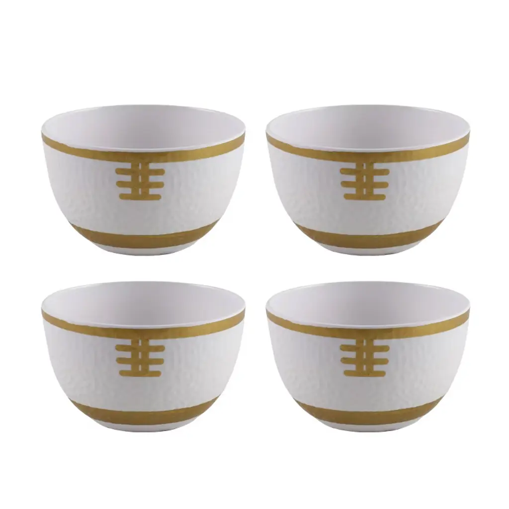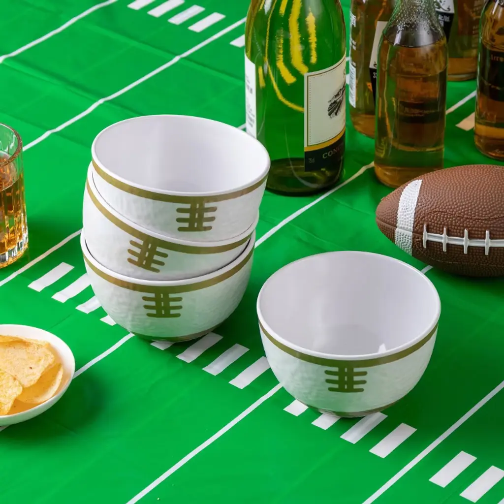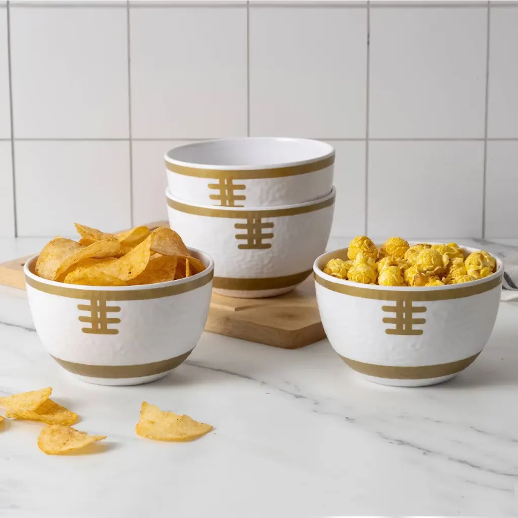 This 4-piece set of small snack bowls is crafted from durable melamine and designed to resemble miniature footballs, making them a fun and functional addition to any sports-themed gathering. Each bowl features a textured surface that mimics the grainy feel of a real football, complete with painted gold laces for a fun touch. Perfectly sized for individual portions of snacks like nuts, candies, dips, or finger foods, these bowls are lightweight, shatter-resistant, and easy to handle. Ideal for game day parties, tailgates, or casual get-togethers, they are also BPA-free and dishwasher safe, offering both safety and convenience for everyday use