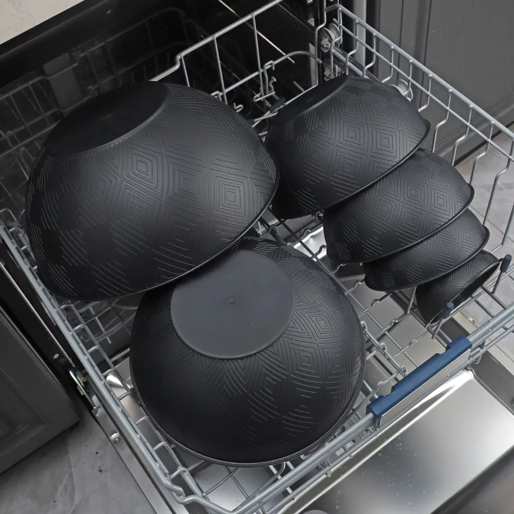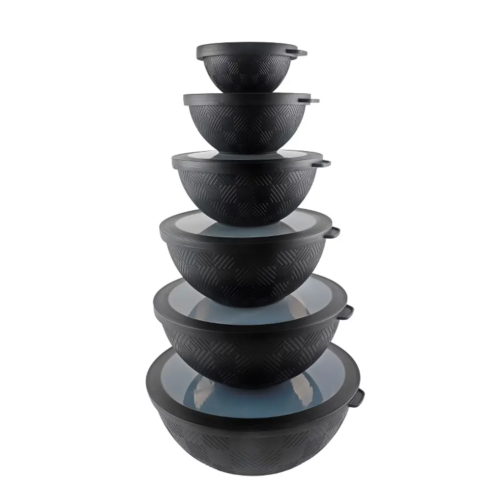 12 Piece nesting bowl set - a practical set of easy to clean kitchen bowls that can be used for food prep, serving, and storing. Set includes 6 plastic bowls and 6 TPR lids; Bowl capacity of 0.32 QT, 0.74 QT, 1.37 QT, 3.69 QT and 5.8 QT. Plastic mixing bowl set made of BPA free durable polypropylene and food safe material. Top rack dishwasher safe, microwave safe and freezer safe. A variety of bowls with tight fitting lids that makes storing and transporting food a breeze. Great for cut up fruit, salads, snacks and for at home and on the go.