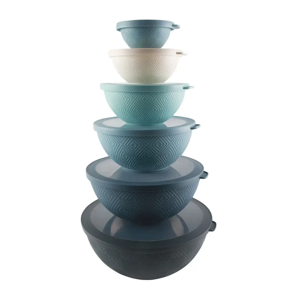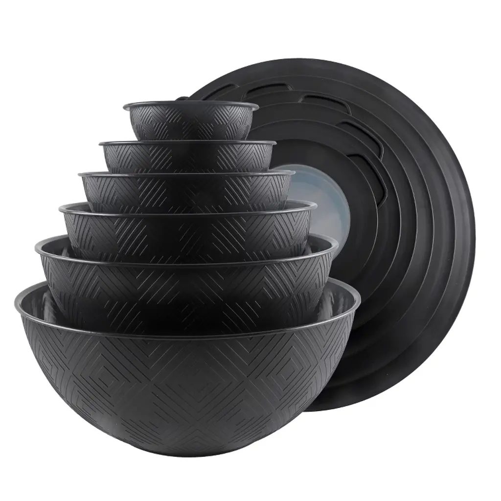 12 Piece nesting bowl set - a practical set of easy to clean kitchen bowls that can be used for food prep, serving, and storing. Set includes 6 plastic bowls and 6 TPR lids; Bowl capacity of 0.32 QT, 0.74 QT, 1.37 QT, 3.69 QT and 5.8 QT. Plastic mixing bowl set made of BPA free durable polypropylene and food safe material. Top rack dishwasher safe, microwave safe and freezer safe. A variety of bowls with tight fitting lids that makes storing and transporting food a breeze. Great for cut up fruit, salads, snacks and for at home and on the go.