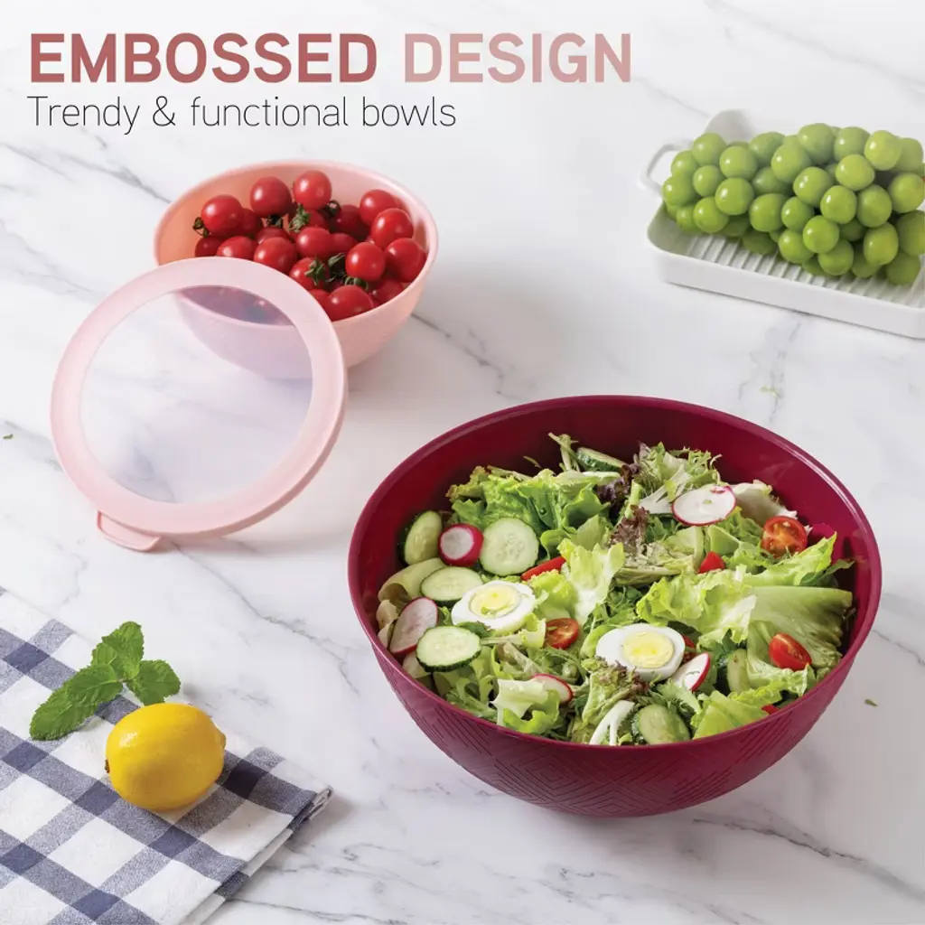 12 Piece nesting bowl set - a practical set of easy to clean kitchen bowls that can be used for food prep, serving, and storing. Set includes 6 plastic bowls and 6 TPR lids; Bowl capacity of 0.32 QT, 0.74 QT, 1.37 QT, 3.69 QT and 5.8 QT. Plastic mixing bowl set made of BPA free durable polypropylene and food safe material. Top rack dishwasher safe, microwave safe and freezer safe. A variety of bowls with tight fitting lids that makes storing and transporting food a breeze. Great for cut up fruit, salads, snacks and for at home and on the go.