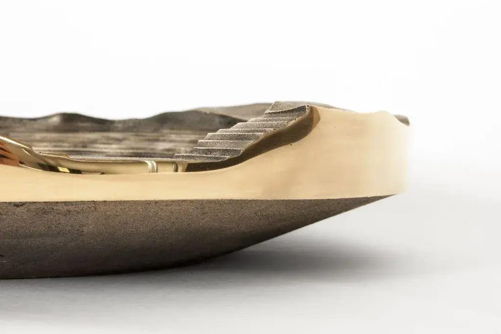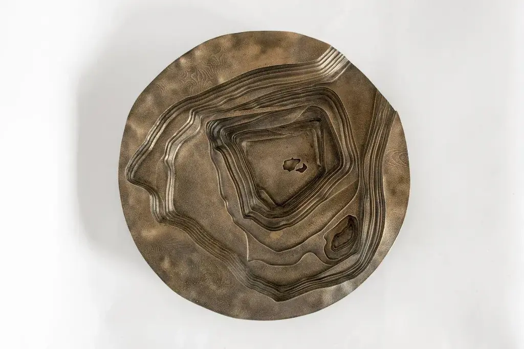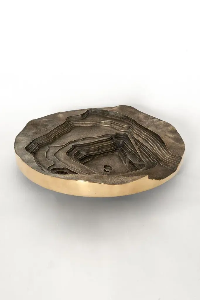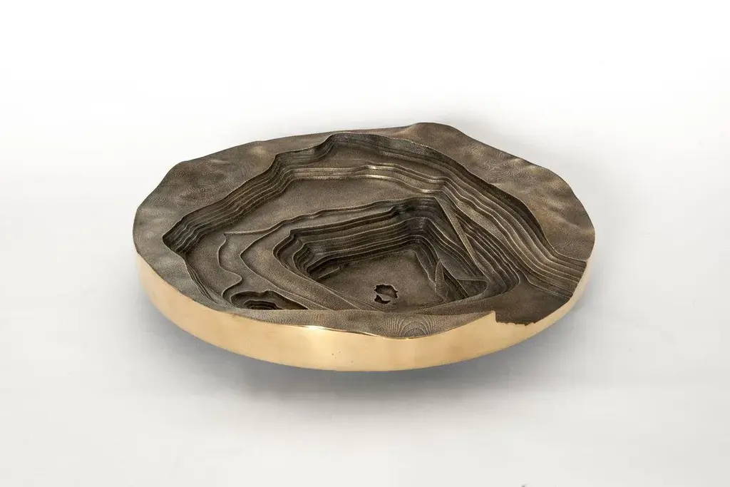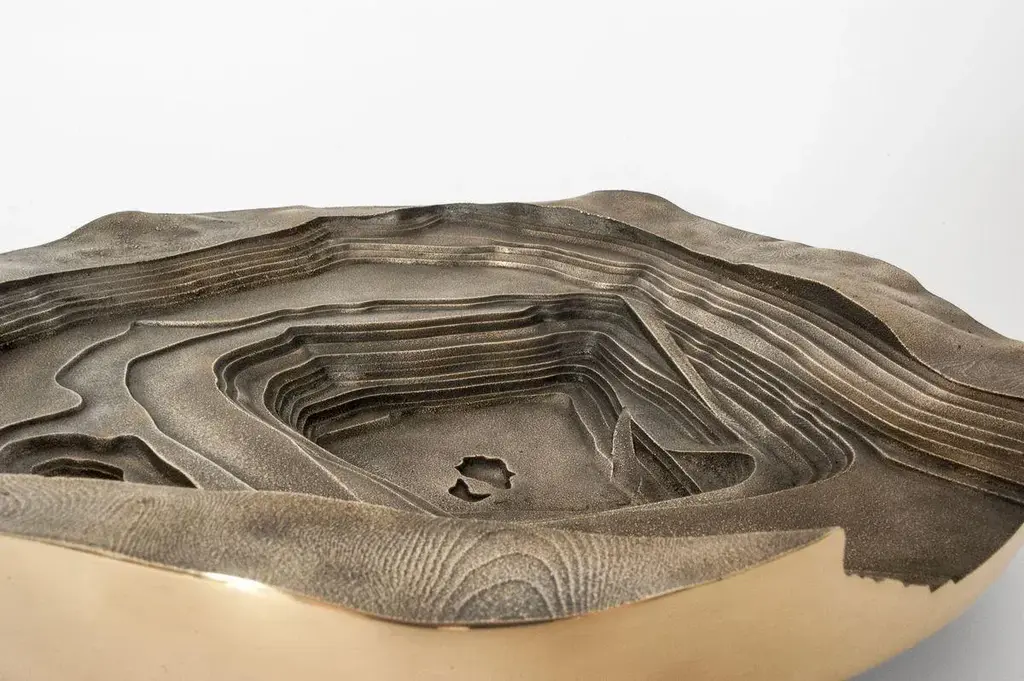 Copper has become a fashionable material. Products in copper are part of many design collections, in many cases for commercial purposes. It has become a one-dimensional material, that is often applied as a skin that sells the product. However, there is much more to say about this intriguing material than that it is simply beautiful.The world’s hunger for copper is ever increasing. Huge amounts of ore have to be taken from the earth’s crust to supply our industries with enough copper. Probably without knowing, we all contribute to this when making a phone call, driving a car or simply switching on the light. It has become an indispensable material in our daily lives. The mines that are the source of the ore, are very intriguing. Their immense scale, relief patterns and the colors of the ore and rocks, are often very beautiful. However, at the same time these mines are scars in the landscape, made by immense machines and the brute force of explosives. To further show the scale of the intriguing open pit mines, a 3D model of a copper mine in Chile has been made. The digital model was made from the satellite images, then 3D printed and used to make a sand mould. In the sand mould bronze (90% copper/10% tin) has been cast. After un-moulding the bronze piece, the casting channels are removed, and the edge sanded and polished.