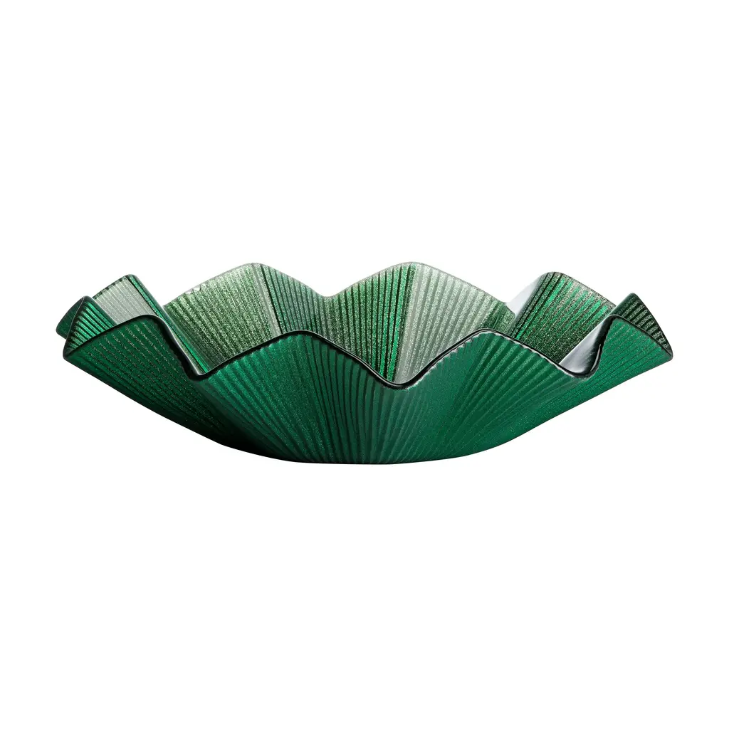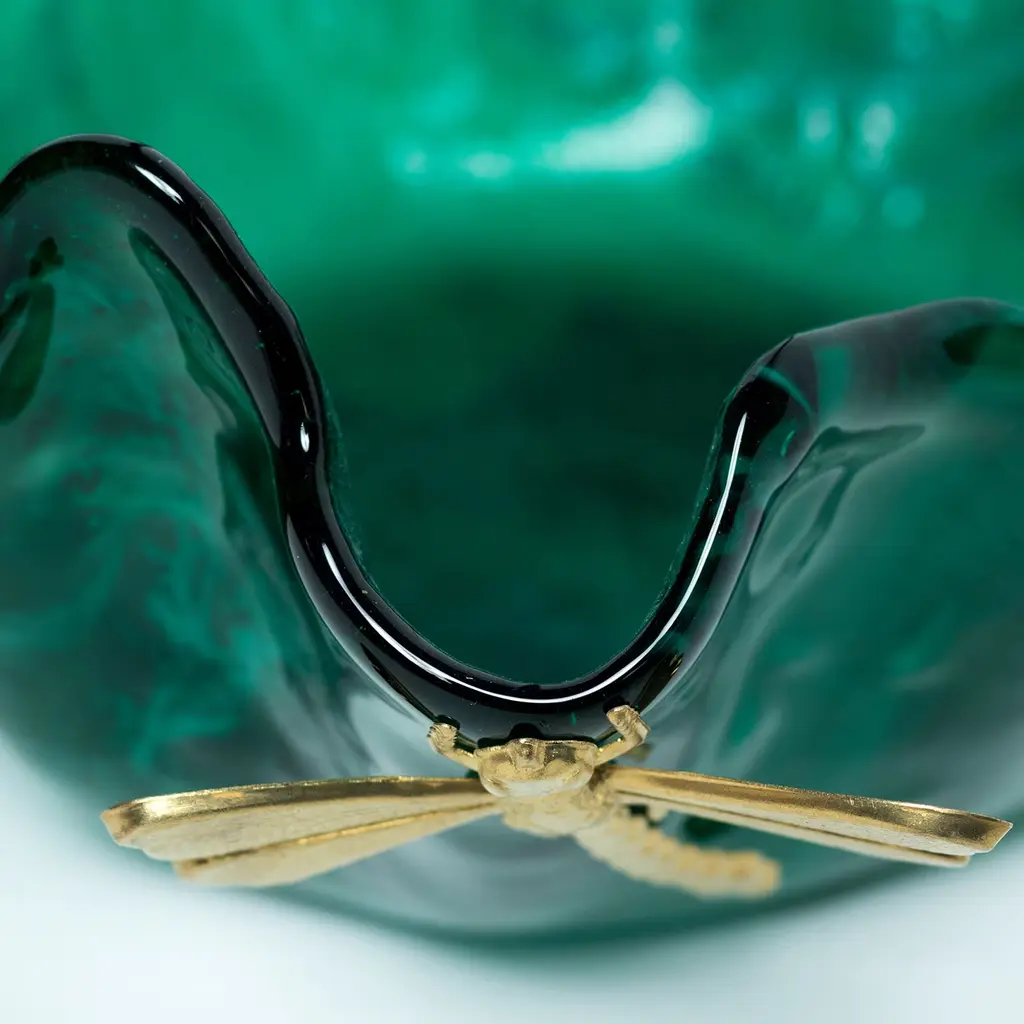 A great classic of the Vetrofuso collection: the corolla bowl. Its dragonfly made of brass conquers customers since more than 20 years because to its unique shape, different in every piece thanks to our technique of glass melting. The main material is Murano glass, the main color of this version is green, but it's possible to customize it in different dimensions and colors.