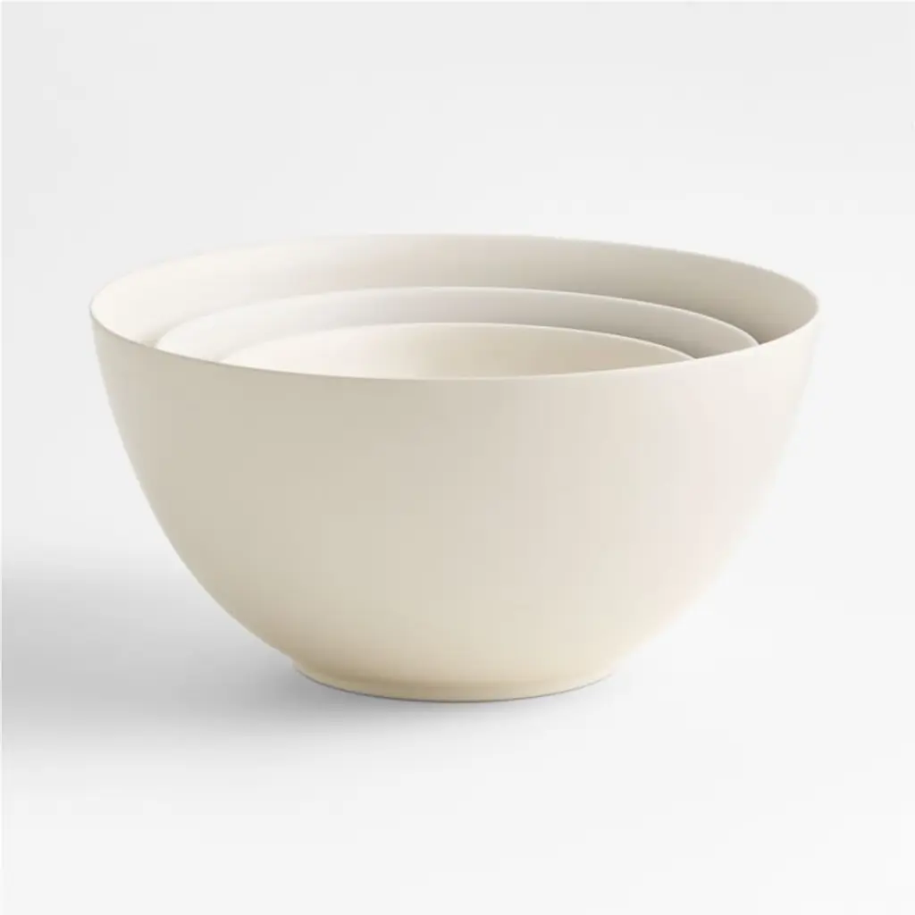 A study in delicious contradictions, our Craft mixing bowls are strong and durable yet light and refined with a warm minimalism that suits everyday prep and elegant meals. A lightly speckled cream glaze coats the three bowls' clean coupe curves. Ideal for mixing, marinating and serving, the mixing bowl set combines beautifully with the rest of our exclusive Craft collection for a modern organic kitchen and table.