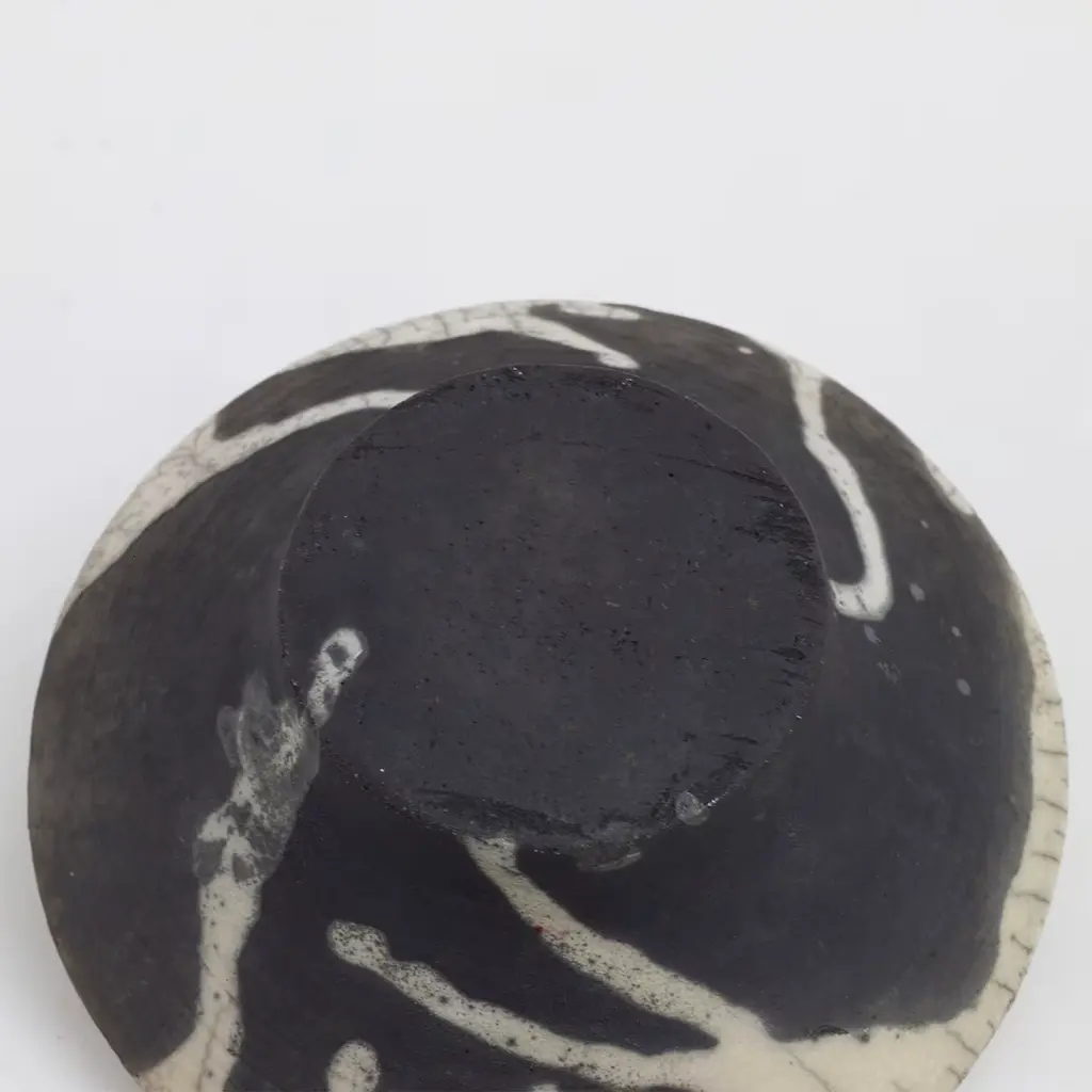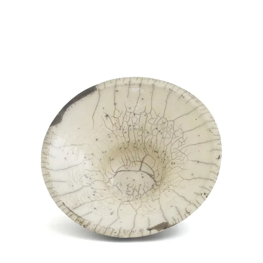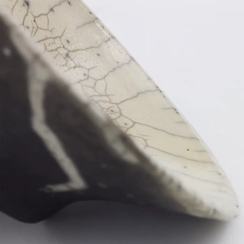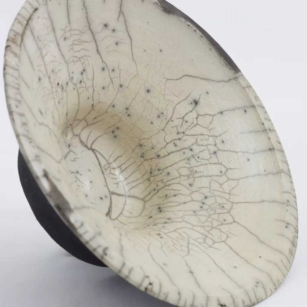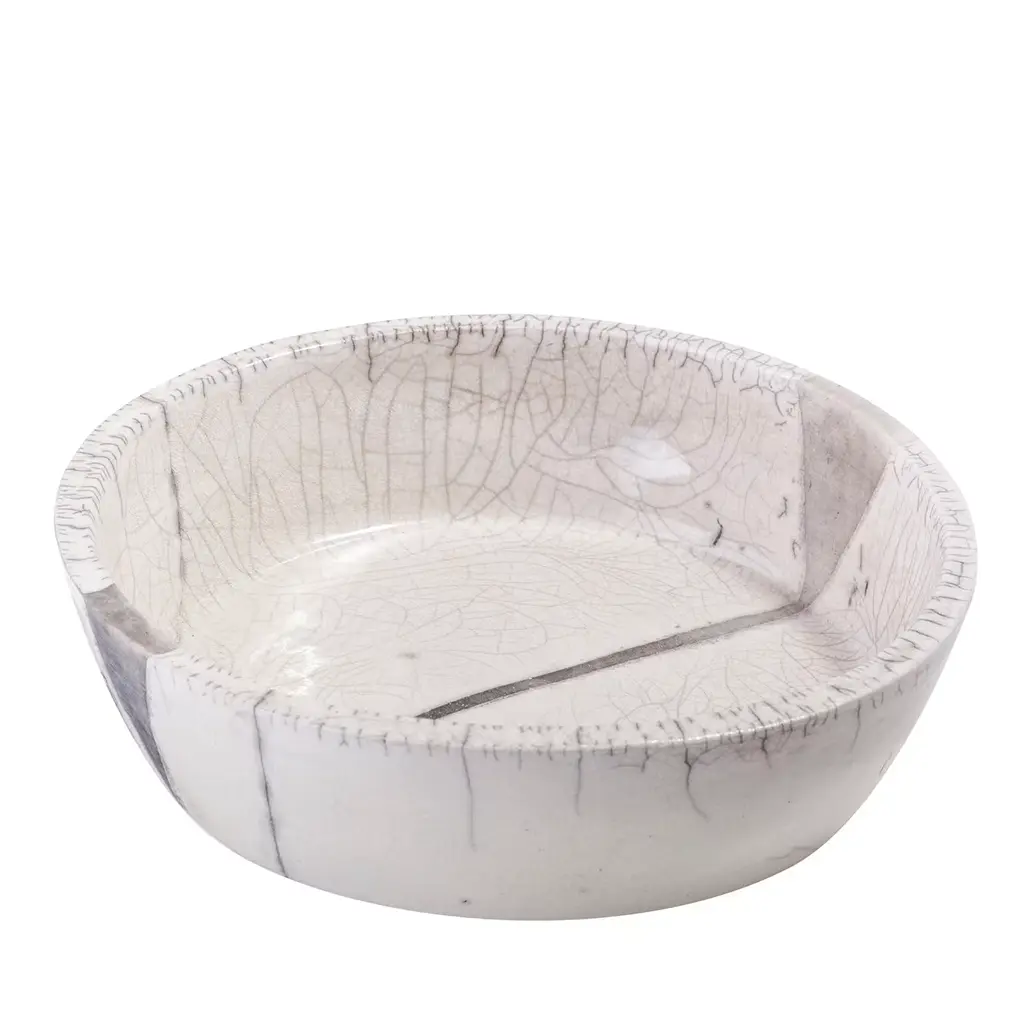 Named after the Italian for crater due to its distinctive shape reminiscent of a volcano's mouth, this handcrafted ceramic bowl flaunts a singular design of speckles and crackles, the latter obtained as a result of the ancient Japanese Raku pottery technique. The white look on the interior - accented with crystalline - seemingly overflows on the external surface, which is marked by an intense dark-gray finish.