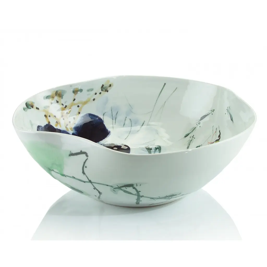 7"H X 19"D A curled-rim porcelain bowl is glazed in oxblood and green. Disclaimer: Due to glazing process, variations in color will occur. No two will be identical.