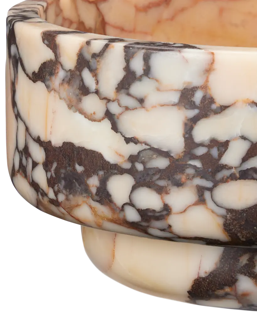The Digby Small Bowl illustrates how artful nature can be. Made of Purple Breccia marble, the complex patterning of the stone makes this a natural focal point for a vignette, or a stunning specimen for holding fruits or vegetables, or left to stand on its own. The peach and purple decorative bowl will stand out whatever its purpose will be. Wipe clean with a soft, dry cloth or static duster. Always avoid the use of harsh chemicals or abrasive cleaners as they may cause damage to the item's finish.