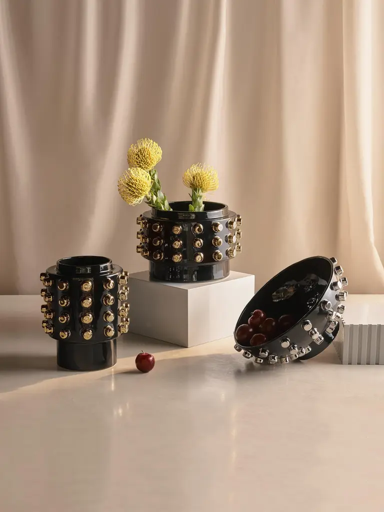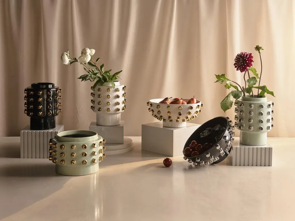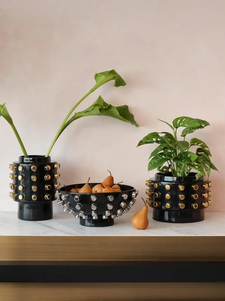 Channelling the raw and rebellious energy of New York’s post-punk scene, the Debbie collection pays tribute to the legendary Blondie frontwoman with a mix of rock-and-roll audacity and sleek downtown style. The bowls, vases and planters are elegantly formed with a glazed-ceramic finish in black, white or sage. Spiked with glittering gold or silver studs, the pieces play up the gritty glamour of the new wave diva and her fellow habitués at punk club CBGB’s.Material: Ceramic & MetalDimensions: Ø33 x H14cm/Ø12.9 x H5.5in