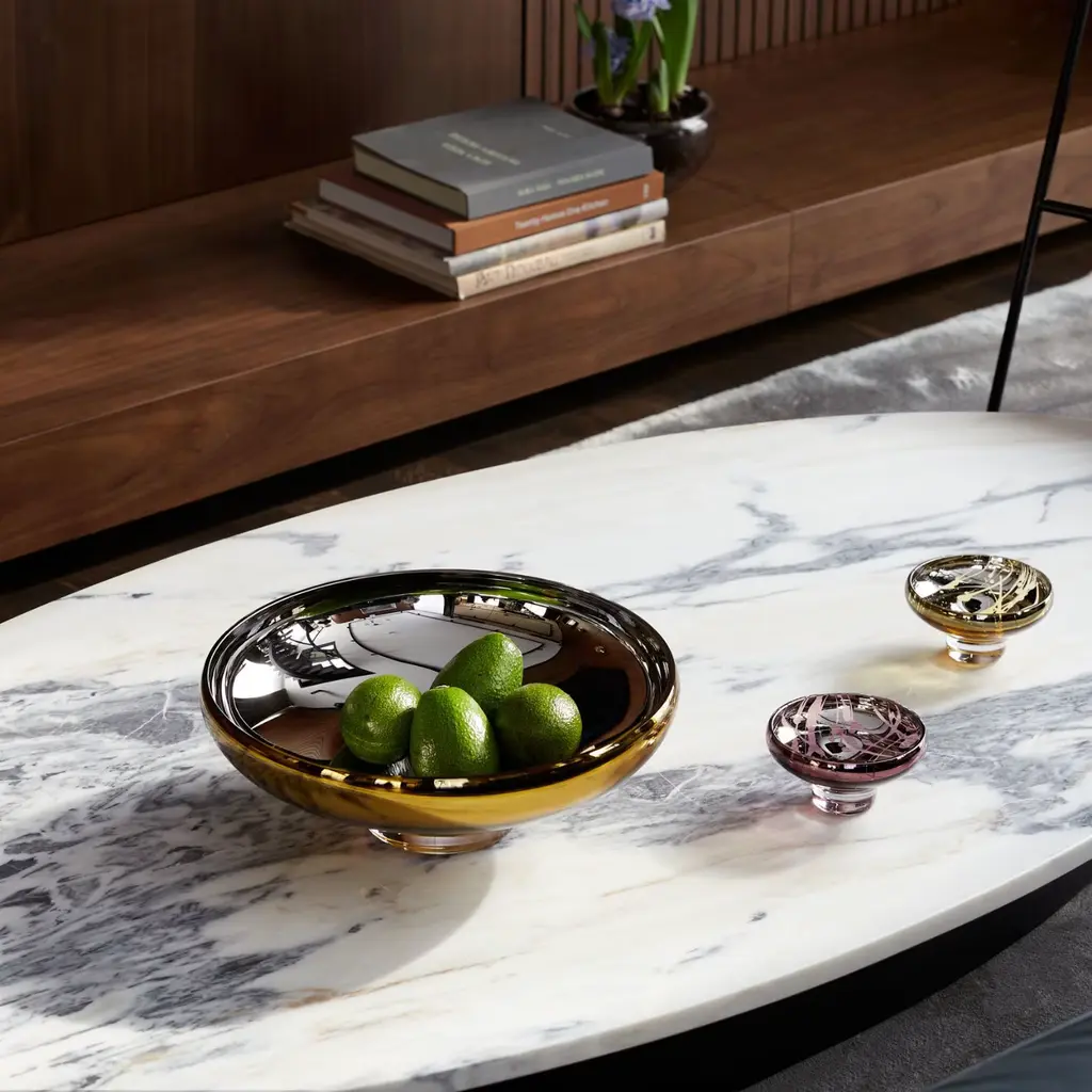Our Bestseller Deco Large Bowl in amber features a one-of-a-kind splashed pattern, beautifully contrasted with the Deco collection’s signature geometric shape and mirror effect. This striking bowl works as both a functional art piece and a statement décor item—perfect for lovers of handblown glass or anyone seeking an unforgettable gift. The warm amber splash adds dynamic depth, enhancing the sophistication and visual appeal of its design.