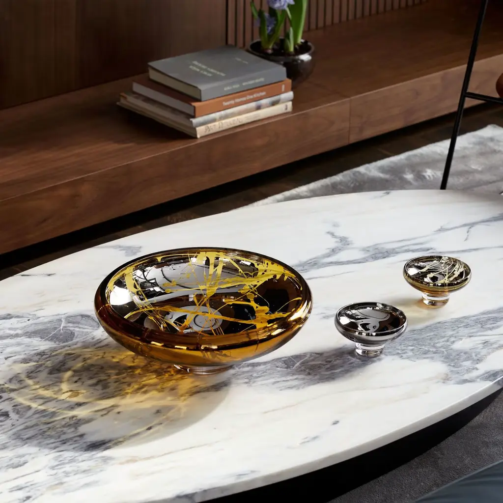 Each handcrafted Deco Large Splashed Bowl in amber features a one-of-a-kind splashed pattern, beautifully contrasted with the Deco collection’s signature geometric shape and mirror effect. This striking bowl works as both a functional art piece and a statement décor item—perfect for lovers of handblown glass or anyone seeking an unforgettable gift. The warm amber splash adds dynamic depth, enhancing the sophistication and visual appeal of its design.