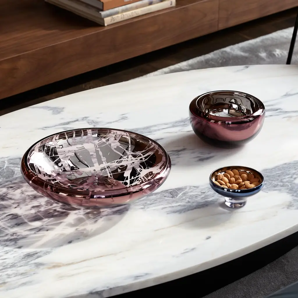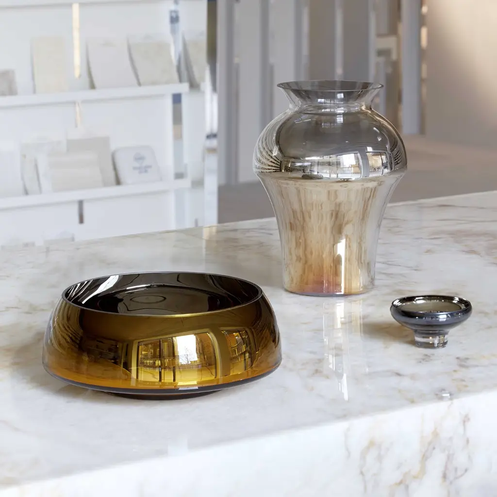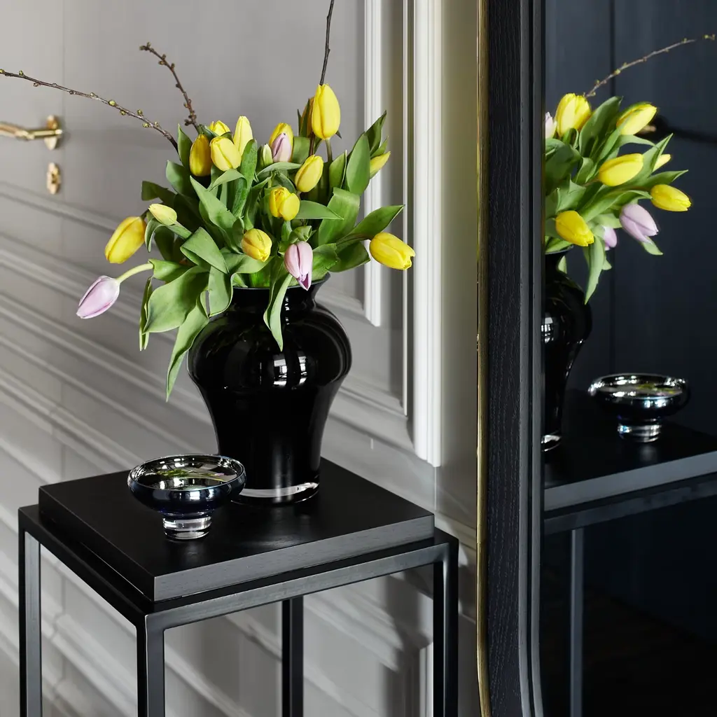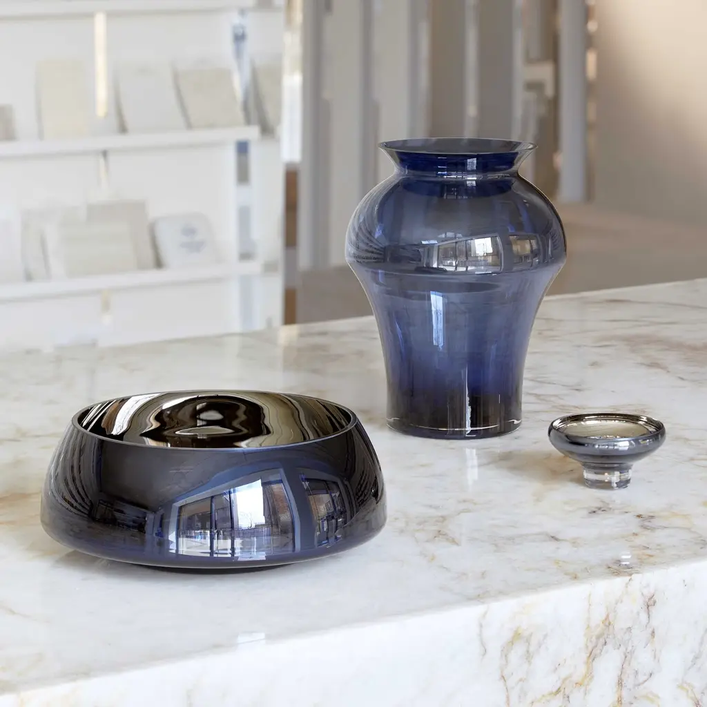 Perfect for serving sweet treats, petite décor items, or holding candles, the Deco Mini Splashed Dessert Bowl in Navy Blue embodies the refined aesthetic of the Deco collection. Its elegant amber exterior and mirror-effect interior create a subtle play of light, making it a delightful serving bowl or chic decorative piece. Each bowl is placed in a black elegant gift box, ready to impress — ideal as a luxury gift or an addition to your tableware collection.Create a cohesive look by using a set of bowls in the same color, or mix and match for a playful and colorful table setting. Features:Amber exterior / mirror interiorElegant black gift box includedPerfect for desserts, small décor, or candles