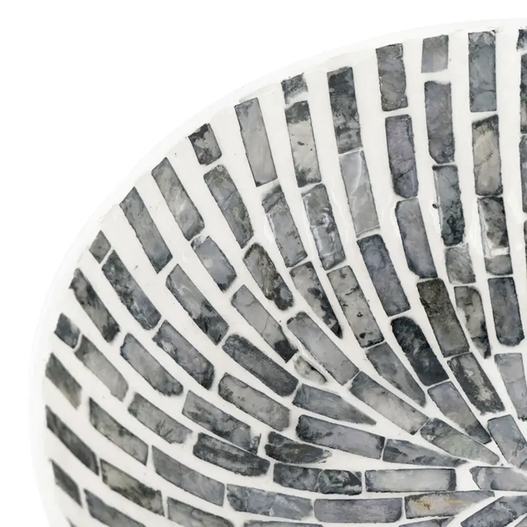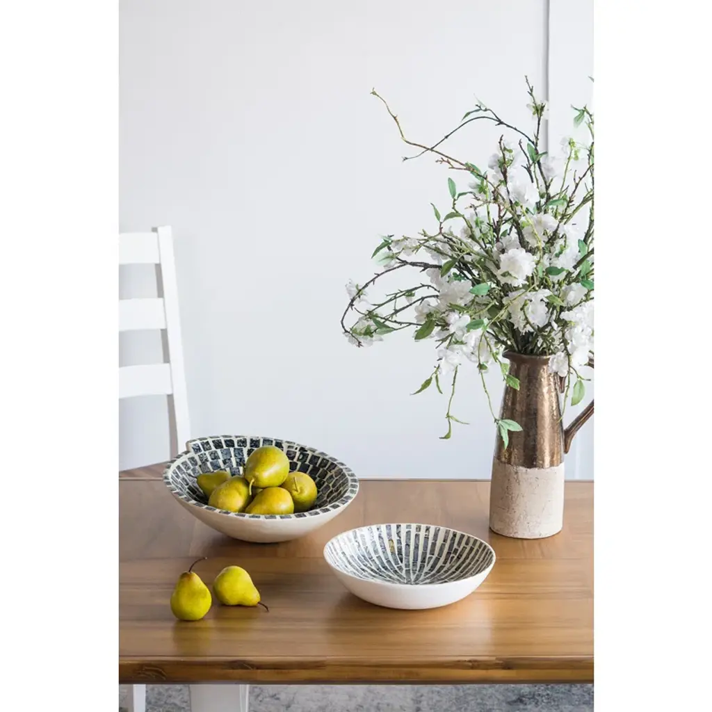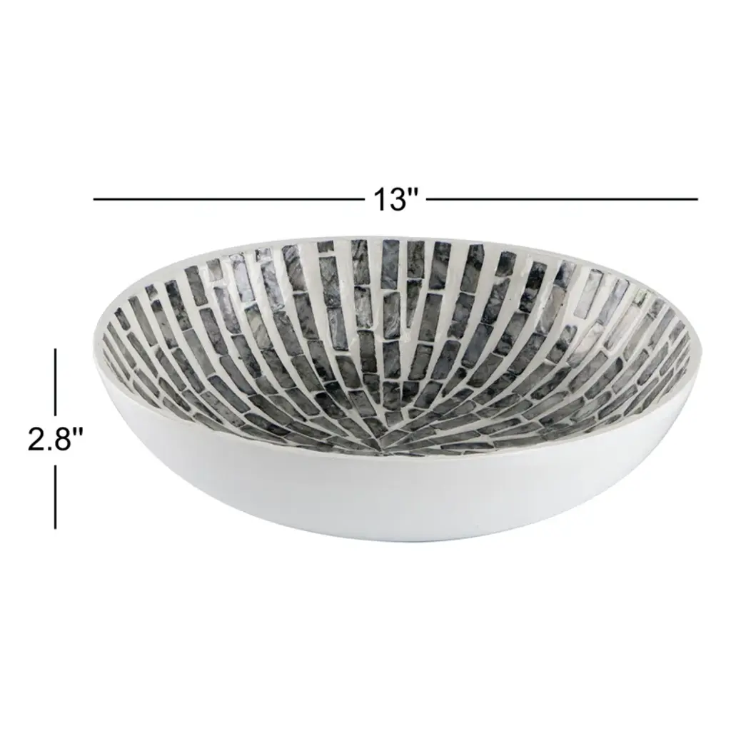 This beautiful two-tone bowl features bamboo and capiz inlay in a black and white frame. A shallow dish made for display or storage, the piece has a clean, linear design. This is a contemporary accent that's perfect for hallway tables, foyers, living rooms, and dining rooms.