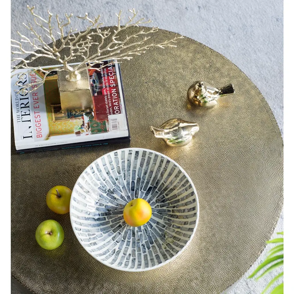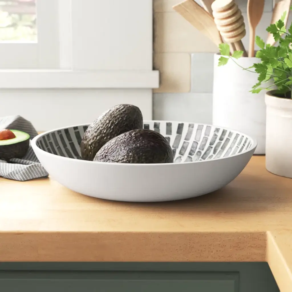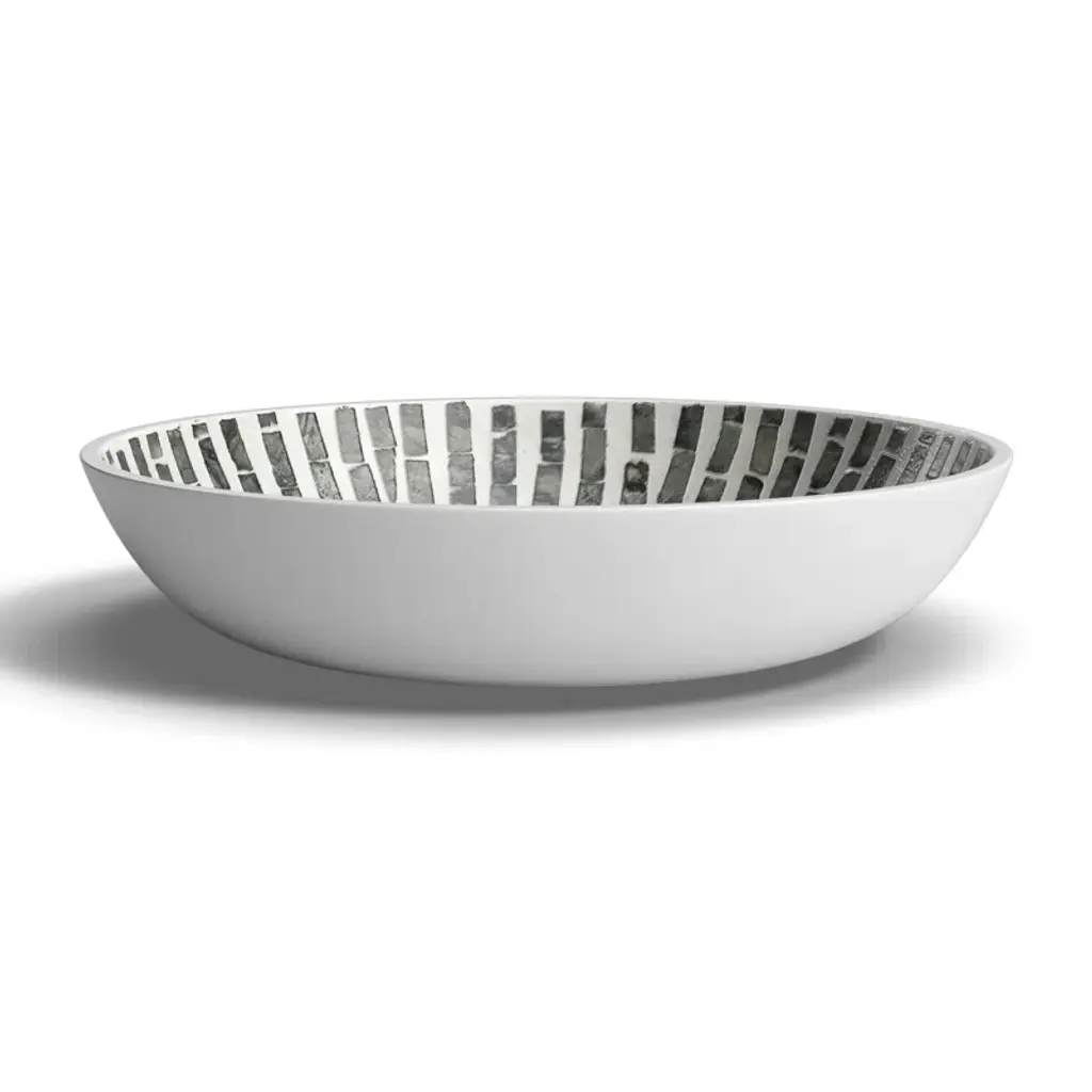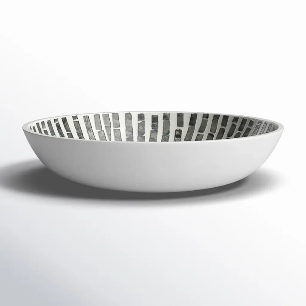 This beautiful two-tone bowl features bamboo and capiz inlay in a black and white frame. A shallow dish made for display or storage, the piece has a clean, linear design. This is a contemporary accent that's perfect for hallway tables, foyers, living rooms, and dining rooms.