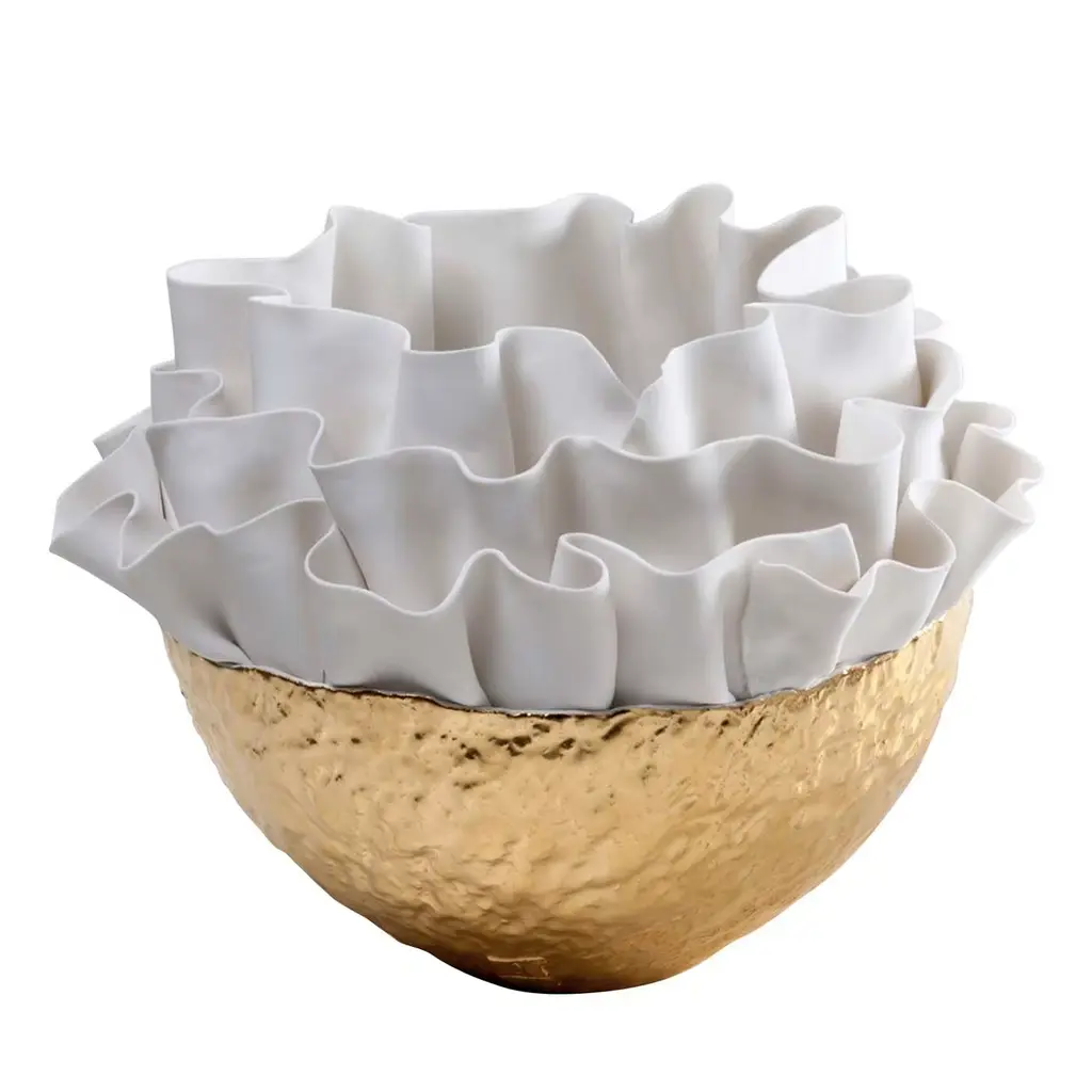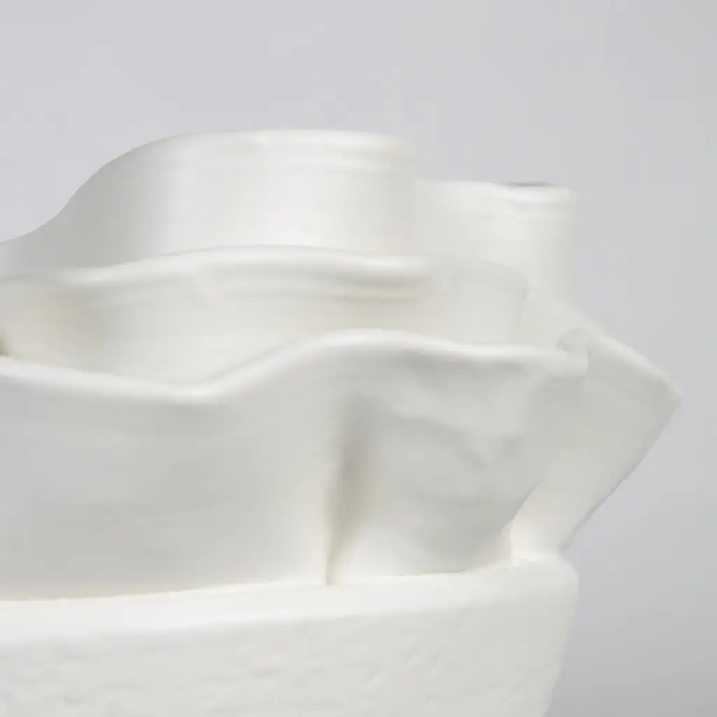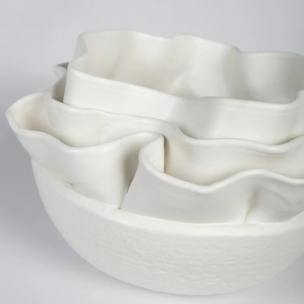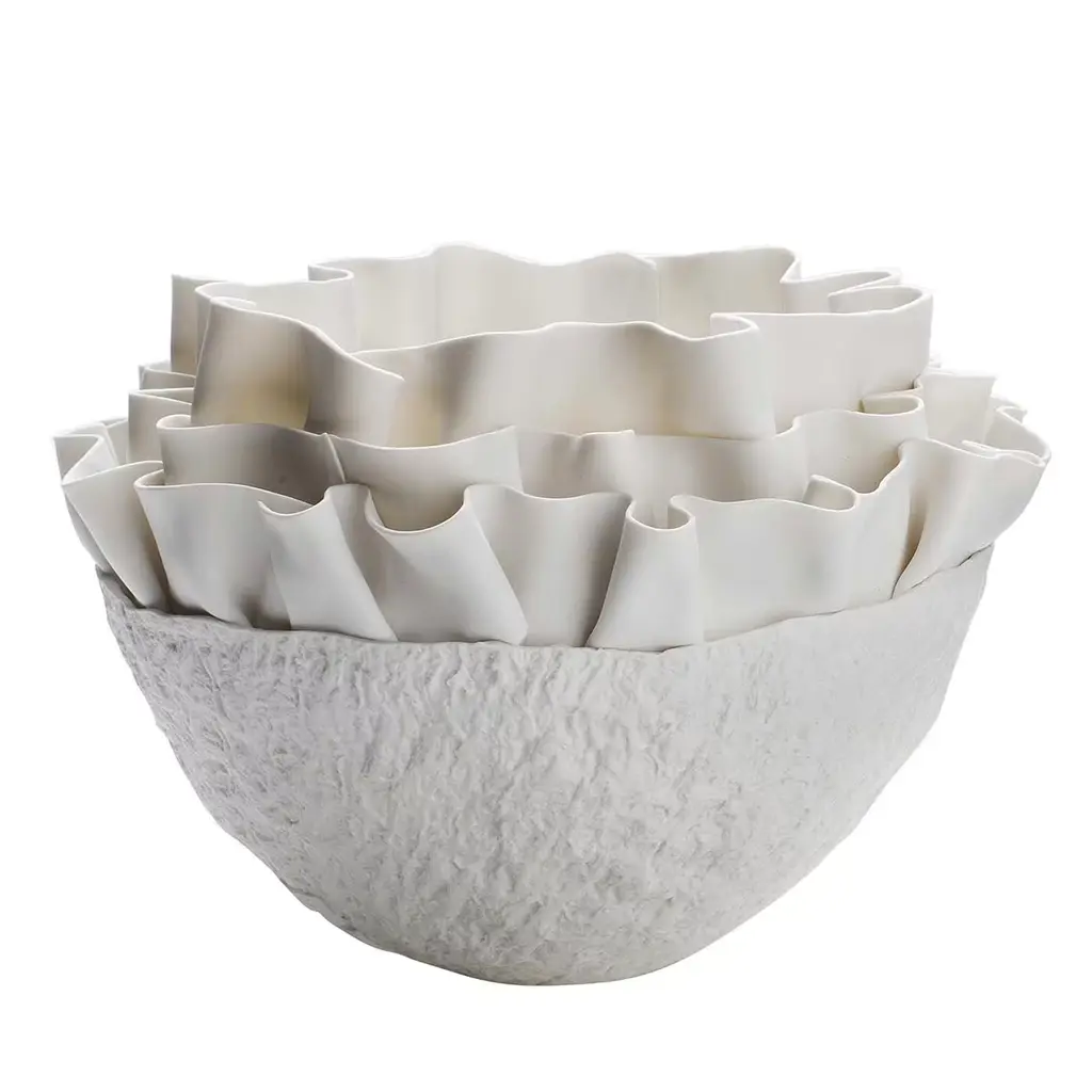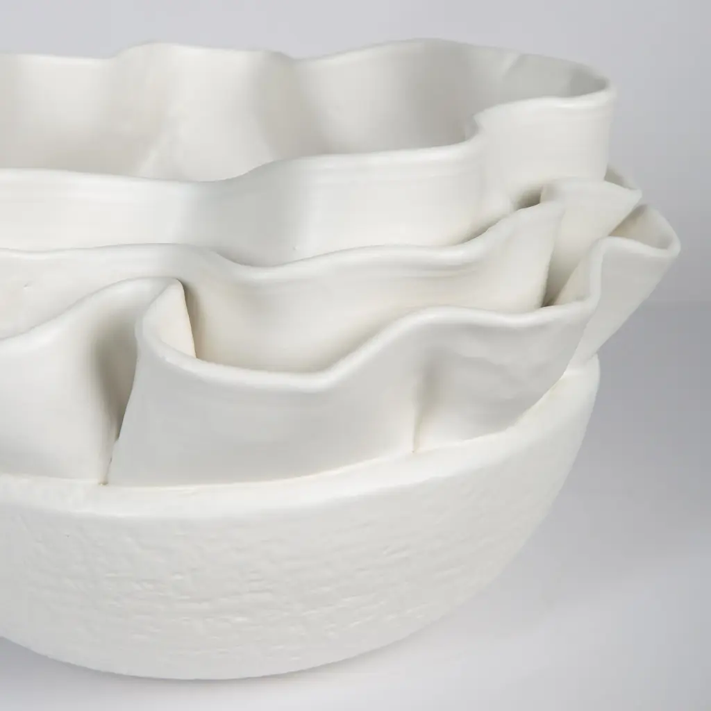 Inspired artistry takes a turn toward elegance with texture and style. This decorative bowl offers a chic look with ceramic construction and a soft white finish. A ribbon-like element emulates folded cloth to embellish its sleek design. Crafted by hand by Italian artist, the single piece of ceramic with its matt finish provides a wonderful transitional touch to a room's decor