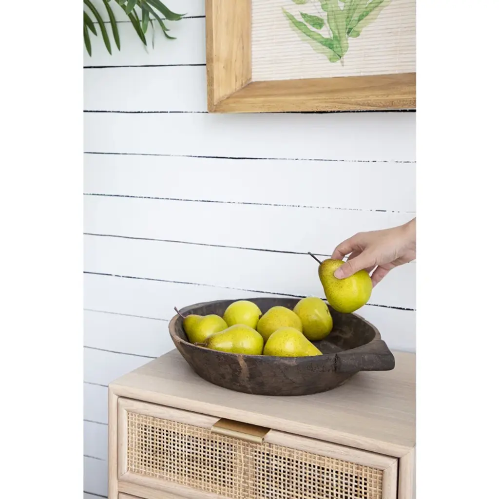 This antique wooden parrot with handle is a medium-sized wooden decorative bowl with two solid handles that are finished in brown for a true rustic appeal. A smart look on kitchen islands, this large bowl is custom-worked to enhance its natural hewn feel. It's a stylish farmhouse look completely revamped from the transitional home.