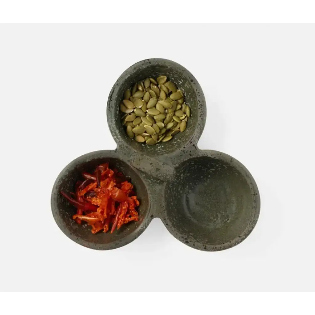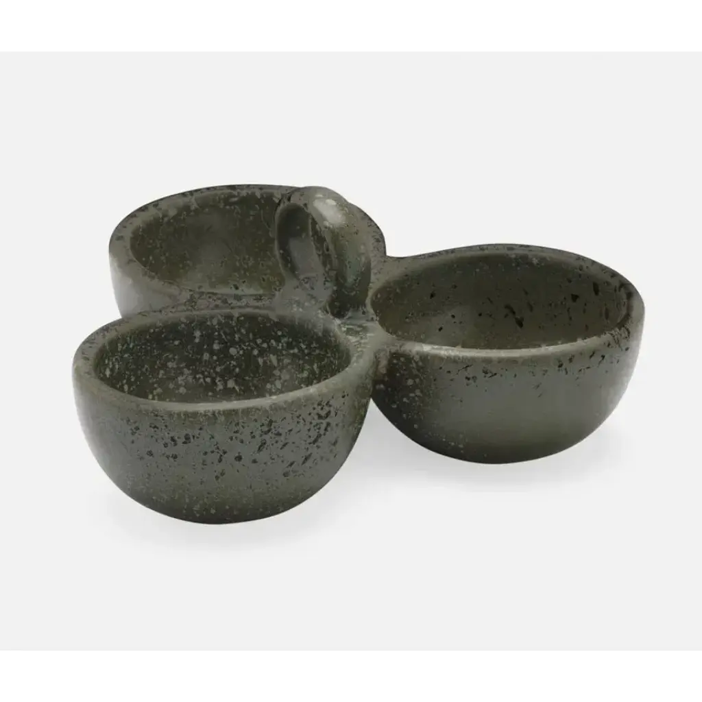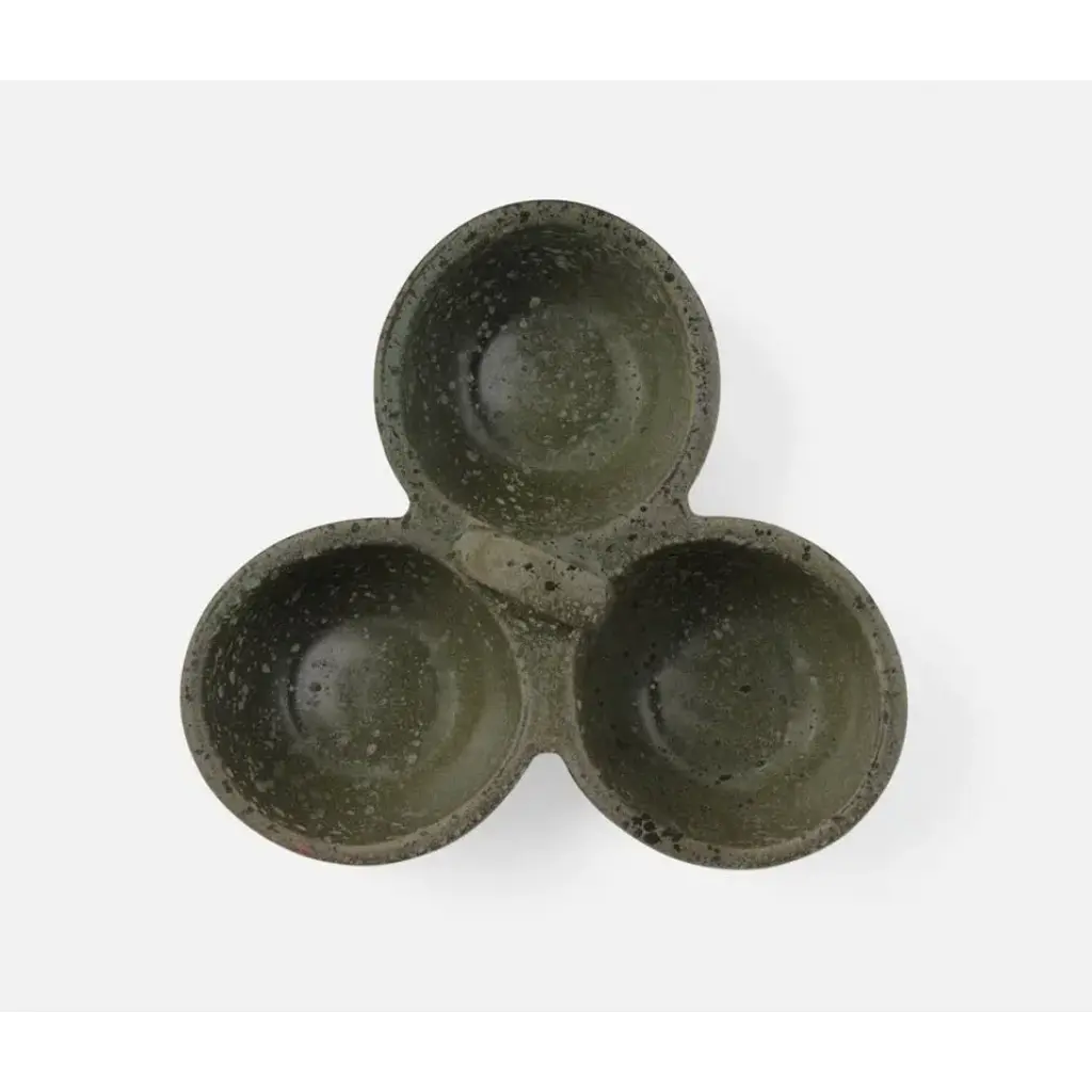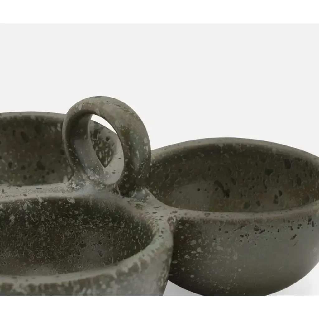 Our Desmond nut dishes pair sleek stoneware with ingenious design: a small ring hovering above either double or triple bowl design for easy carrying from room to room. Available in Midnight Teal, Gray Salt, White Salt Glaze, or Chartreuse Salt Glaze. Blue Pheasant's products are handmade with care by artisans using natural materials. They are not mass produced, so variation between products should be expected, and this is why we love them! It is these irregularities that makes Blue Pheasant what it is—a special brand whose collections are distinctly handmade, full of charm and originality you’ll never find in machine-made products.