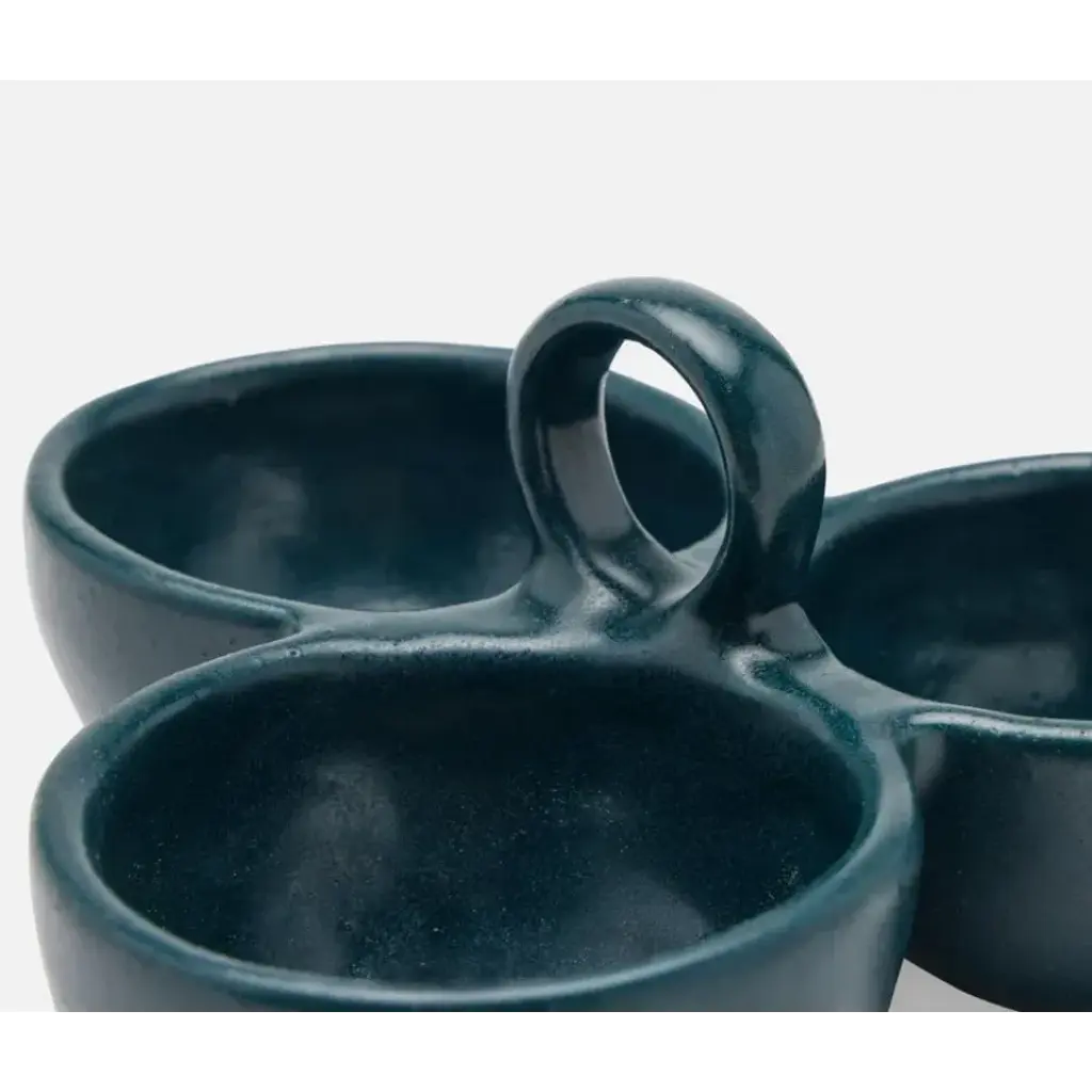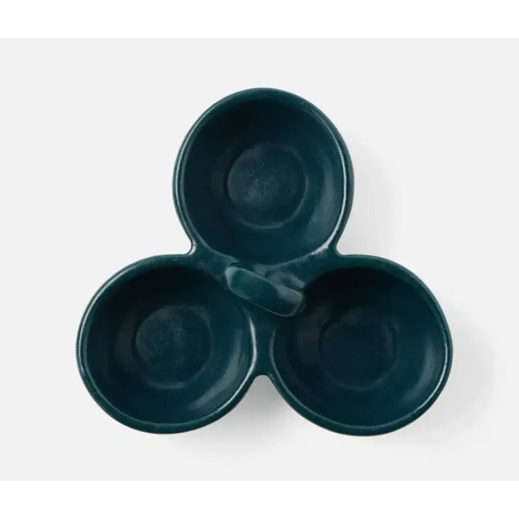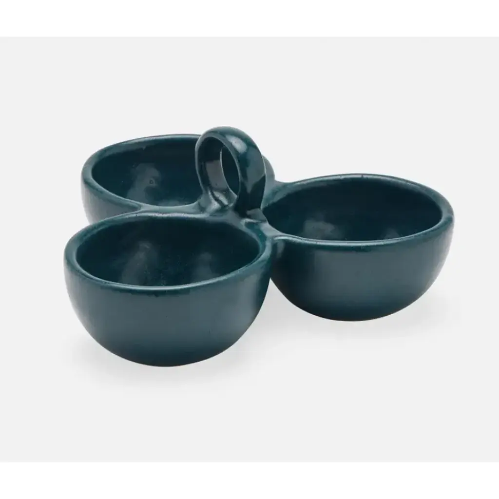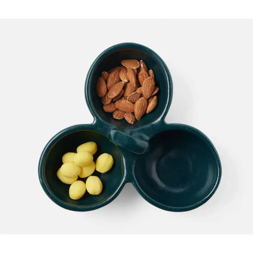 Our Desmond nut dishes pair sleek stoneware with ingenious design: a small ring hovering above either double or triple bowl design for easy carrying from room to room. Available in Midnight Teal, Gray Salt, White Salt Glaze, or Chartreuse Salt Glaze. Blue Pheasant's products are handmade with care by artisans using natural materials. They are not mass produced, so variation between products should be expected, and this is why we love them! It is these irregularities that makes Blue Pheasant what it is—a special brand whose collections are distinctly handmade, full of charm and originality you’ll never find in machine-made products.