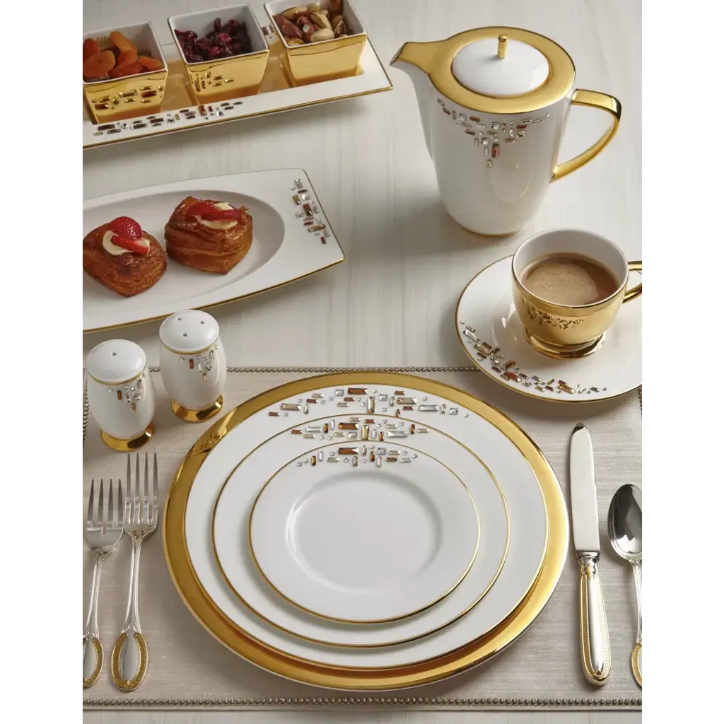 Inspired by the Roman goddess of the moon, Diana dinnerware glows with power and beauty. Bathed in a clear moonlit glow, each graceful plate is edged in hand-painted, 24 kt gold or platinum and adorned with Swarovski crystals. Each gem is like a tiny piece of moonlight. A truly one-of-a-kind statement, Prouna Jewelry china makes a great wedding gift, and is sure to become a prized family heirloom. Prouna Jewelry marries the beauty of fine bone china dinnerware with the sparkle of Swarovski Crystal Elements. Sculptural white china serves as an elegant base to hand-painted designs, gold and platinum ornamentation and dazzling arrays of Swarovski crystals. With several patterns to choose from, each with its own unique story, you're sure to find one you love. The crystals are attached with a special method that is tested dishwasher safe. A true marriage of technology and style, Prouna Jewelry Dinnerware is the height of luxury.