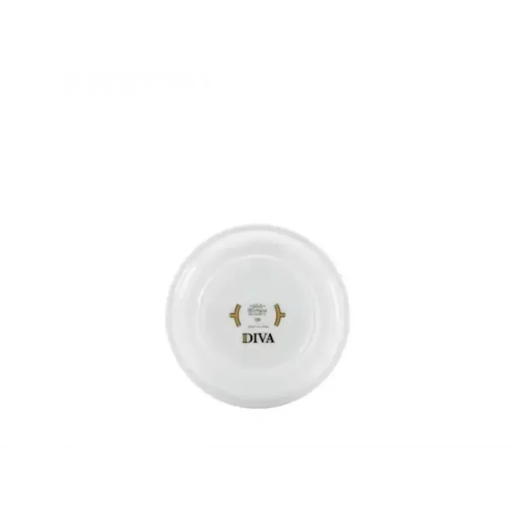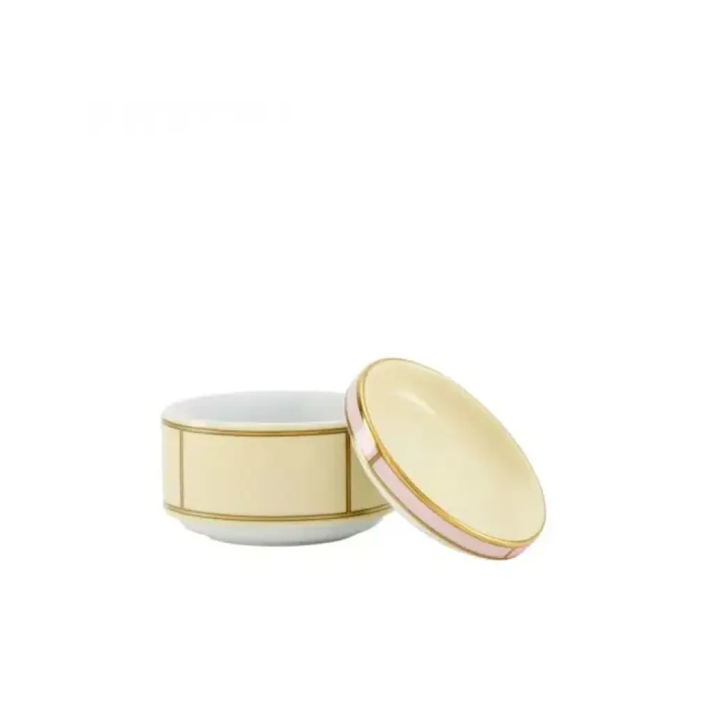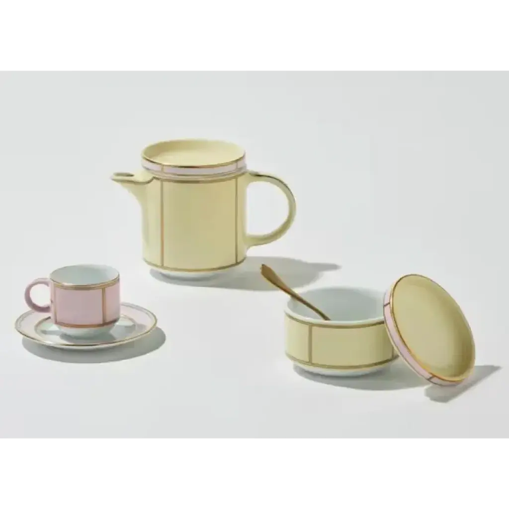 Porcelain sugar bowl with Giallo and gold decoration. New Diva collection. Fine Porcelain embellished with a yellow decorative motif enriched with delicate gold threading. The lid is a contrasting shade of pink. Versatile and functional, the sugar bowl can be taken apart to serve as a small cup and plate that enrich convivial occasions from appetizer to dessert. Diva is a vintage-inspired collection of tableware and giftware that evokes the dreamlike atmosphere of the 1950s and celebrates the great movie divas of the era. It pays tribute to the history of Ginori 1735, re-envisioning through a contemporary lens Giovanni Gariboldi's Colonna shape, which earned its designer the prestigious Compasso D'Oro award in the mid-1900s.