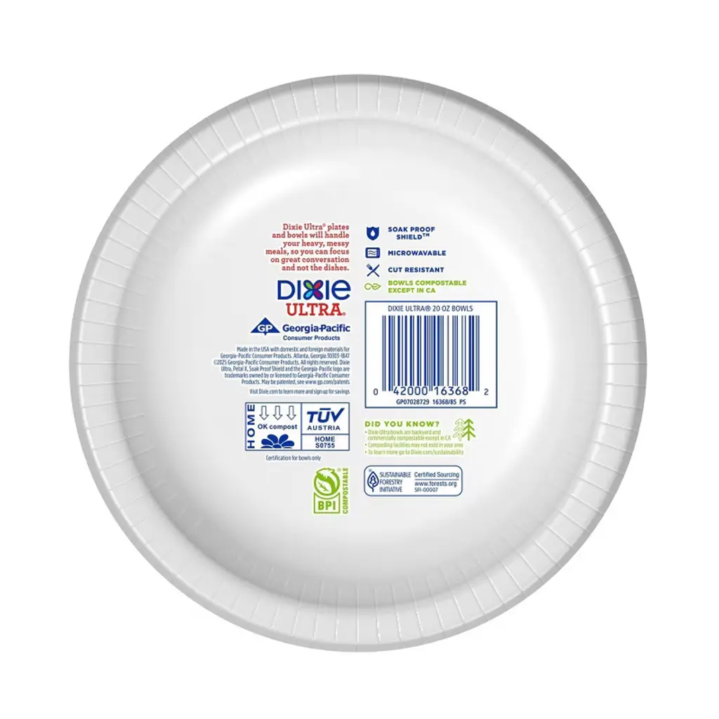 LIMITED EDITION SUMMER DESIGN! Dixie Ultra® disposable paper bowls feature a summer design and are backyard and commercially* compostable except in CA. Serve your summer side dishes with confidence and ease.** Featuring Flex-Proof® Technology, these bowls are made to withstand even your heaviest menu favorites. They’re also microwavable, cut-resistant, and equipped with a Soak Proof Shield™ to handle sauces, grease, and salad dressings. Perfect for backyard grilling and get-togethers, Dixie Ultra® bowls offer both style and durability. Stock up today and enjoy the convenience of reliable, disposable bowls. *These facilities are limited and may not be available in your area. **All Dixie-branded paper bowls, cups, and plates manufactured in Georgia-Pacific facilities are kosher certified by the Orthodox Union.