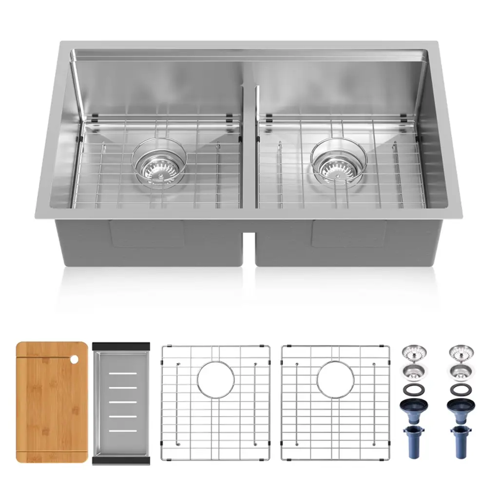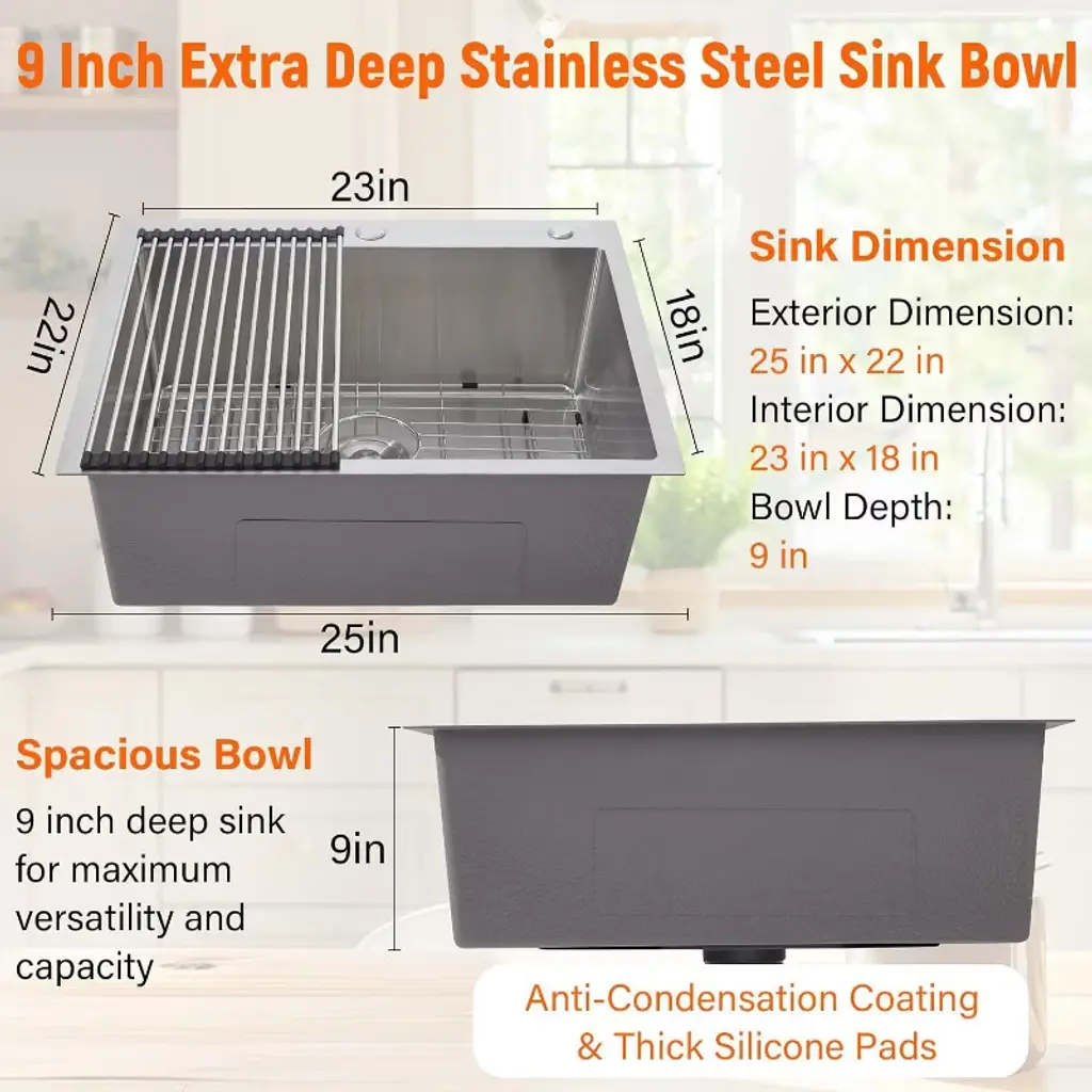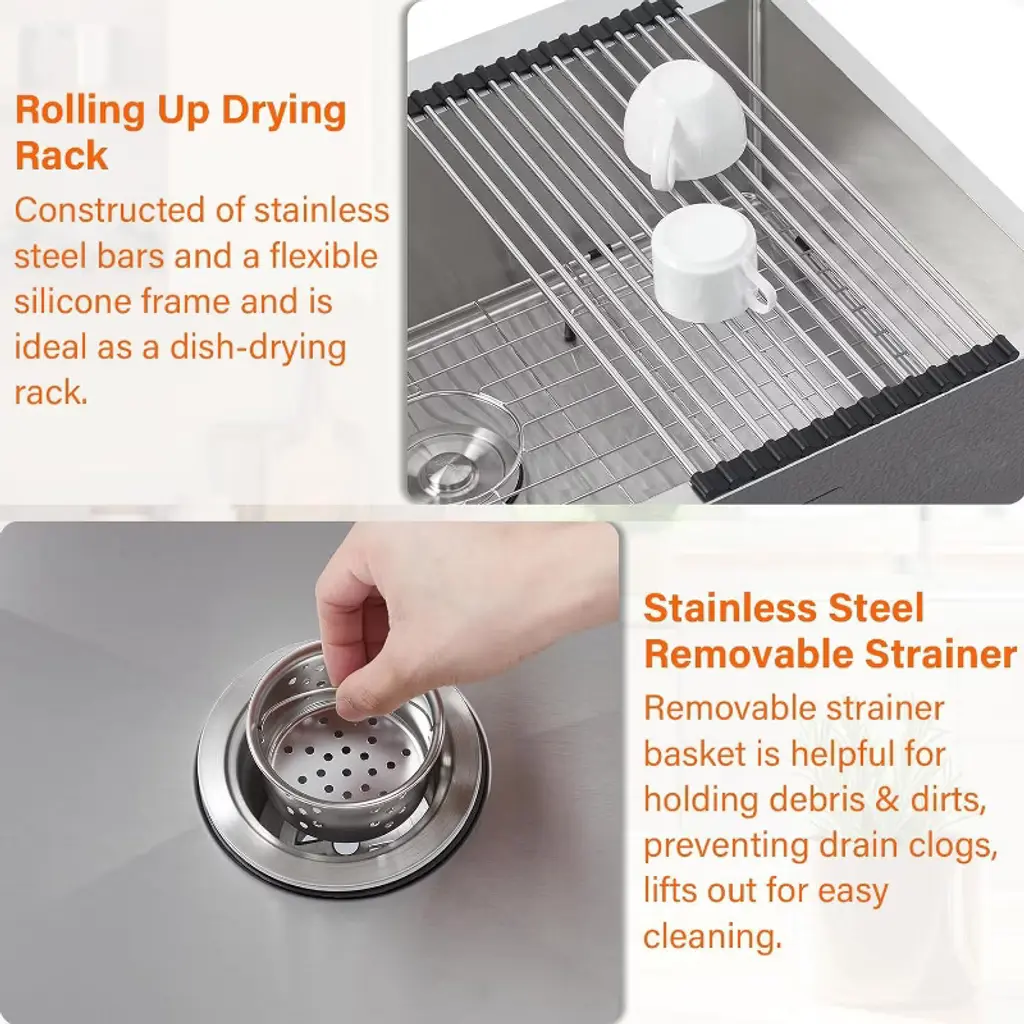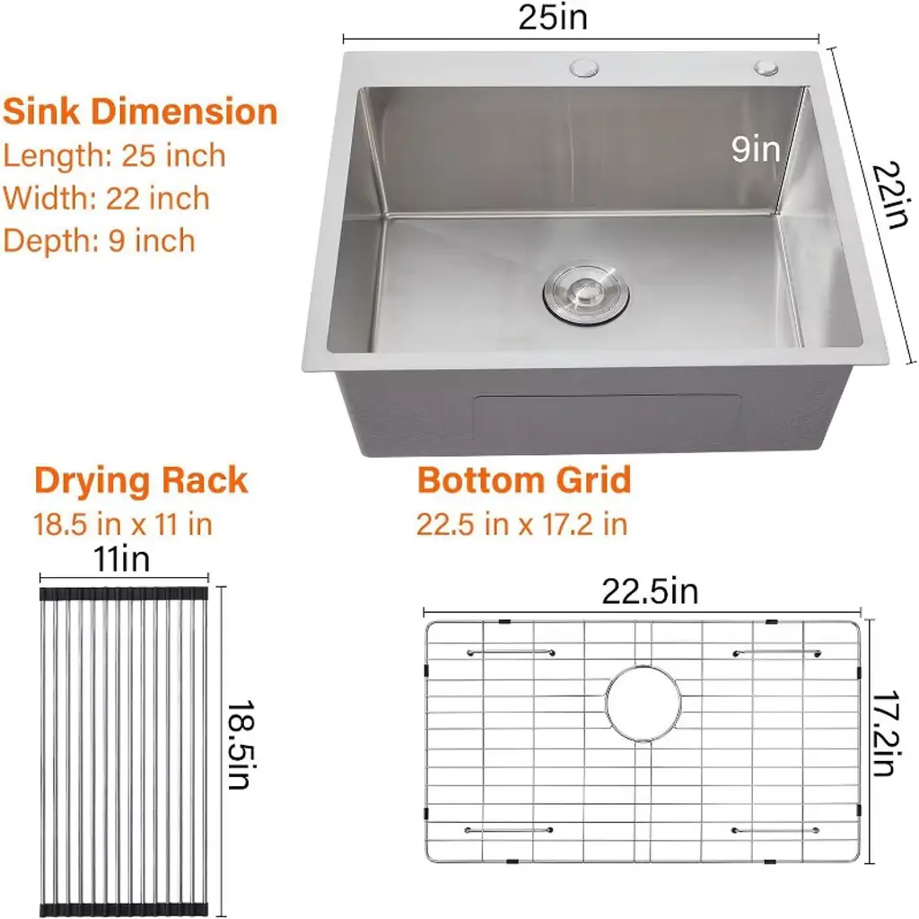 Picture this: It's after dinner, and instead of dreading the mountain of pots in your sink, you're actually enjoying the cleanup. That's the difference a truly well-designed sink makes. This 304 stainless steel powerhouse isn't just another basin At 3mm thick (that's 51% thicker than most sinks), this laughs off heavy cast iron pans and won't dent when you drop that stockpot. The brushed finish magically hides water spots, so it always looks freshly cleaned—even when you're rushing through morning coffee prep. Remember that awful sound of silverware clanging in the sink? Gone. The built-in sound pads soak up noise like a sponge, so you can run the disposal without waking the baby. Plus, the clever insulation keeps your cabinet dry, no more musty smells or warped wood. Cleaning is stupid easy—the sloped bottom sends water racing to the drain, while those smooth rounded corners won't trap yesterday's pasta sauce. Just a quick wipe and you're done. Installation? Even easier. The drop-in design pops right into your countertop, and all the plumbing parts are included. No calling your handyman cousin for help. It even comes with bonus goodies: a foldable rack for drying dishes right over the sink, a protective grid to keep your good knives from scratching the surface, and rubber pads to prevent slipping. This isn't just where you'll wash dishes—it's where you'll prep vegetables, thaw seafood, soak baking sheets, and maybe even bathe the family dog. After years of struggling with flimsy sinks, don't you deserve one that finally works as hard as you do?
