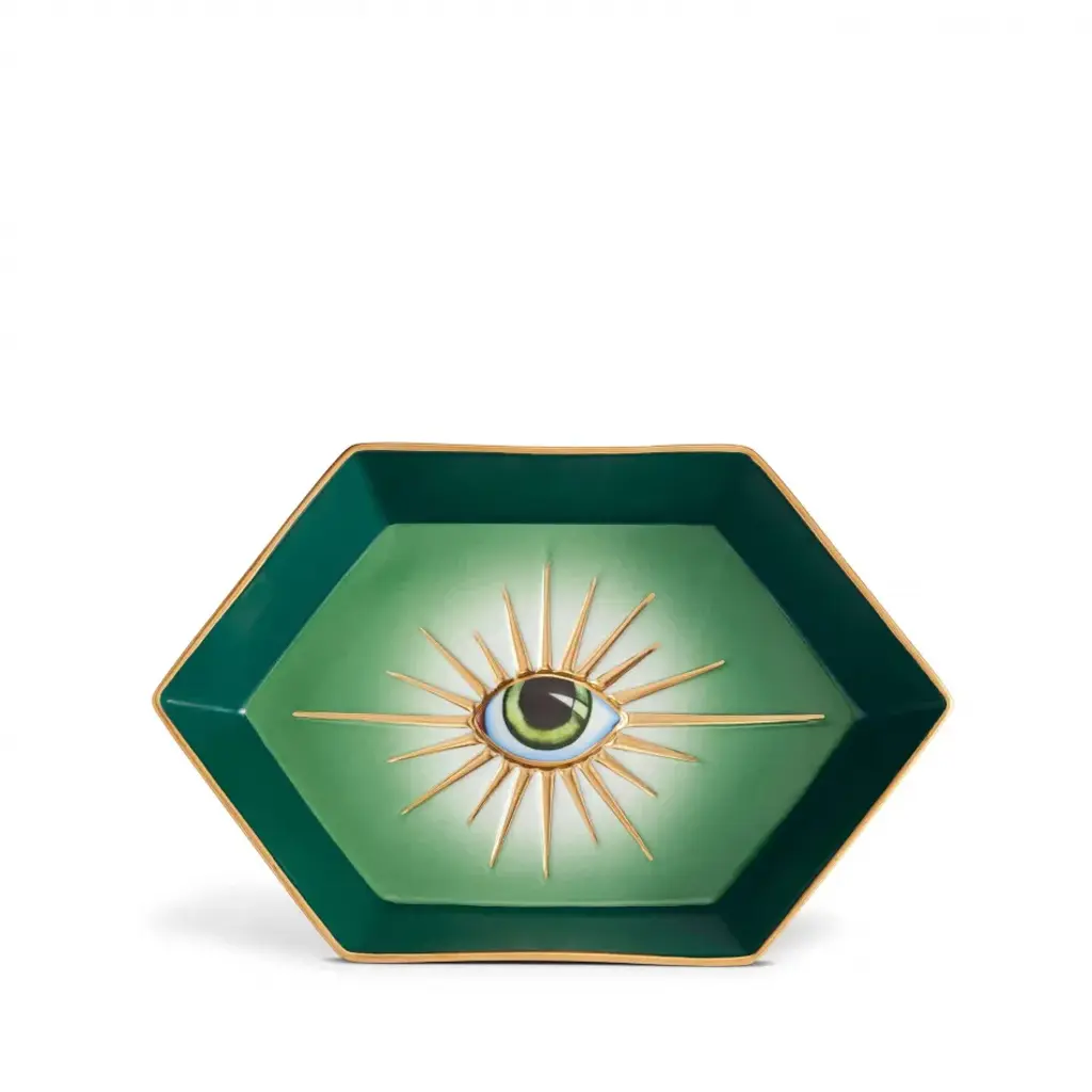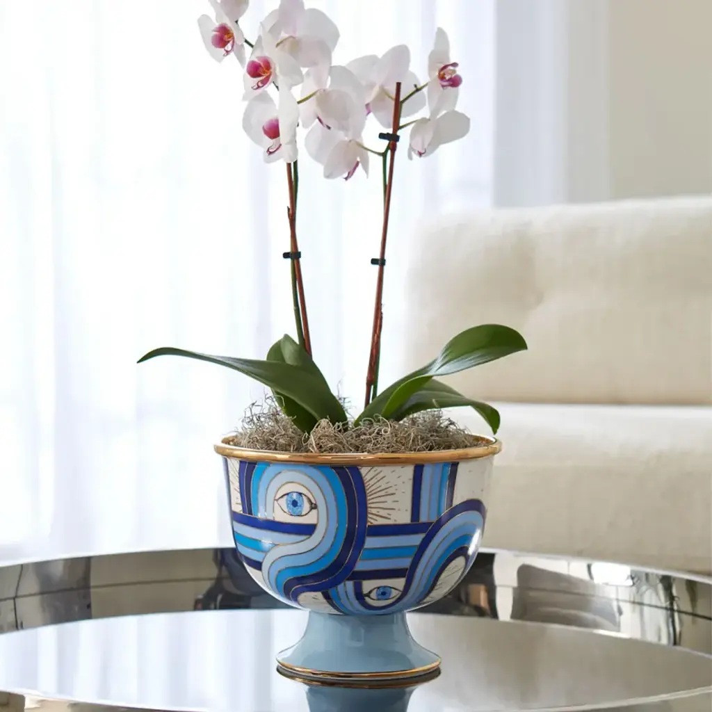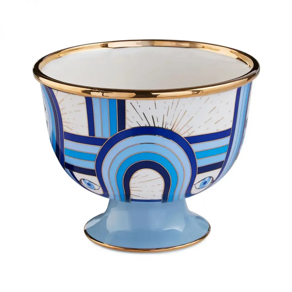 Dream Catcher.Expand your horizons with dreamy third-eye mindscapes rendered in Delft-inspired blues and accented with real sparkly gold. High-fired porcelain elevates the experience. Our Druggist Large Bowl features a unique design on its front and back—rotate to refresh your view. A surreal addition to your table, shelf, or mantel. Style it with our other Druggist pottery and create your own dreamscape.