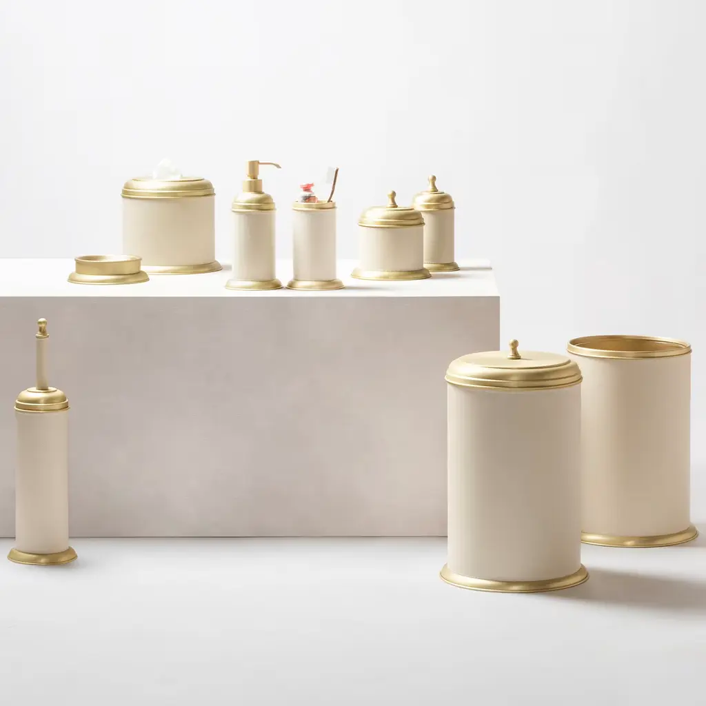 The Dubai bathroom collection features a series of articles with a fine leather-covered metal structure with different finishes of choice. The collection boasts a series of sinuous sculptural volumes that take inspiration from Oriental architecture resulting into a design imbued with a graphic, elegant, complex simplicity. Metal structure. Non-slip waterproof rubber base underneath. Metal finishes available: chrome / bronze / brass / shiny gold.