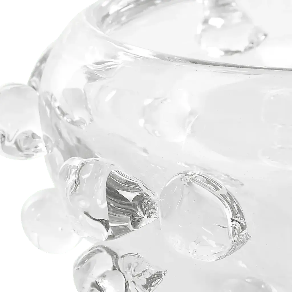 Enhance your home decor with the Eico clear glass bowl, adorned with organic glass spheres accenting the surface. This stunning piece combines modern sophistication with artistic flair, making it the perfect addition to any room.
