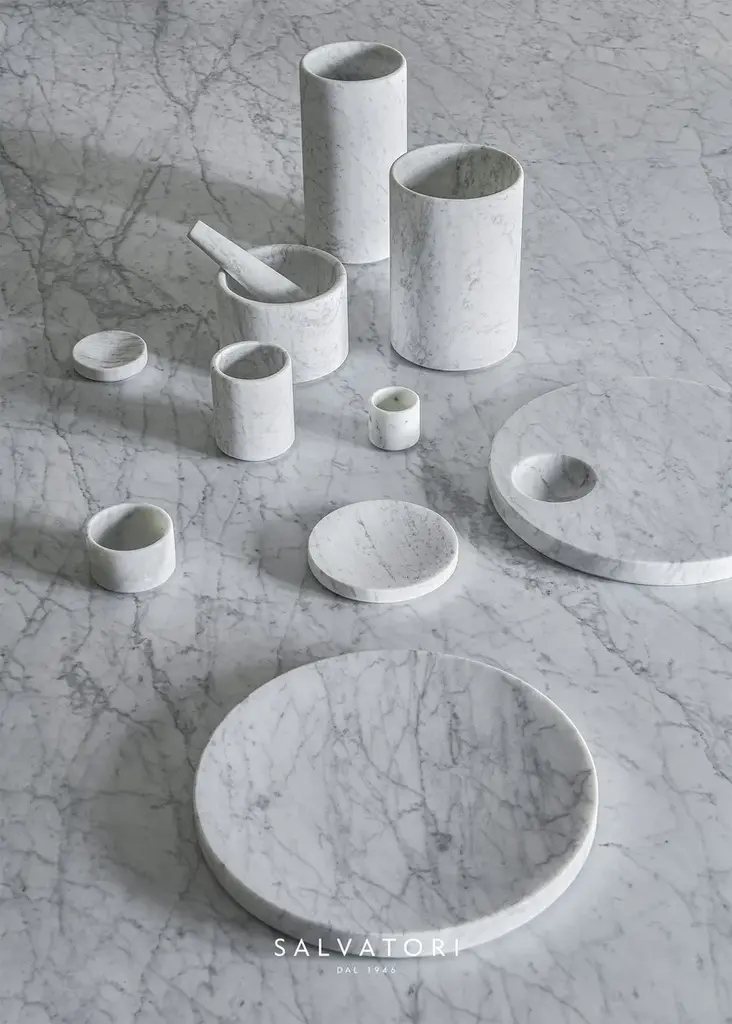 John Pawson has created a family of vessels and utensils for the home whose powerful affinities include rigorous simplicity of form, materiality and function. Each of the pieces comprising the Ellipse Collection is fabricated from a single seamless piece of Bianco Carrara marble. Circular in plan, the pieces share details of geometry and proportion, with variation in the character of the internal curve determined by embedded rituals of use. Contrasting polished and sandblasted textures create subtle differentiation between flat and contoured surfaces, for the eye and for the hand.