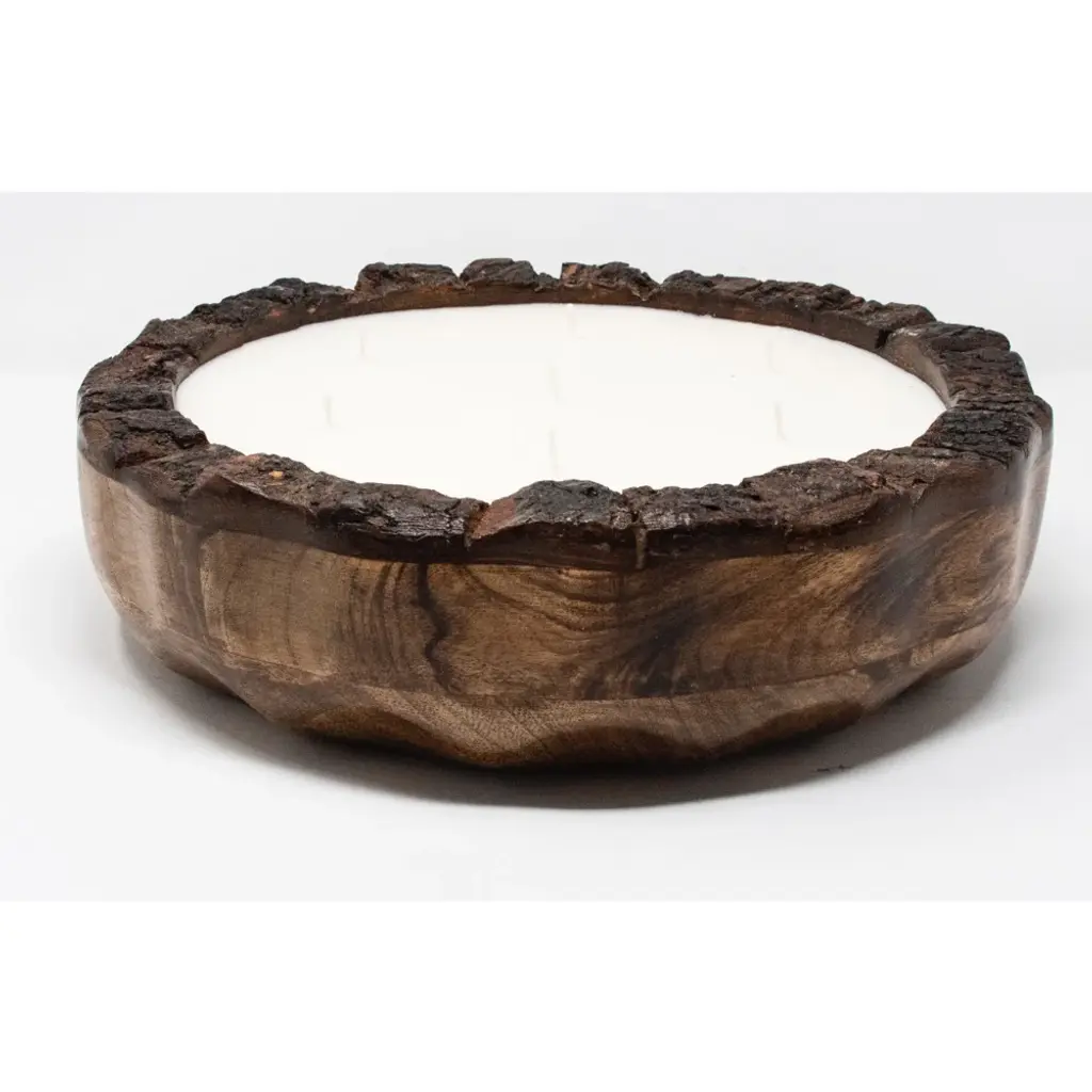 Made from renewable mango wood with reclaimed tree bark, this candle is hand poured in a chunky wood bowl. Elevating the outdoors and bringing it inside. Available in various scents. Reusable as a decor piece after burn is complete.