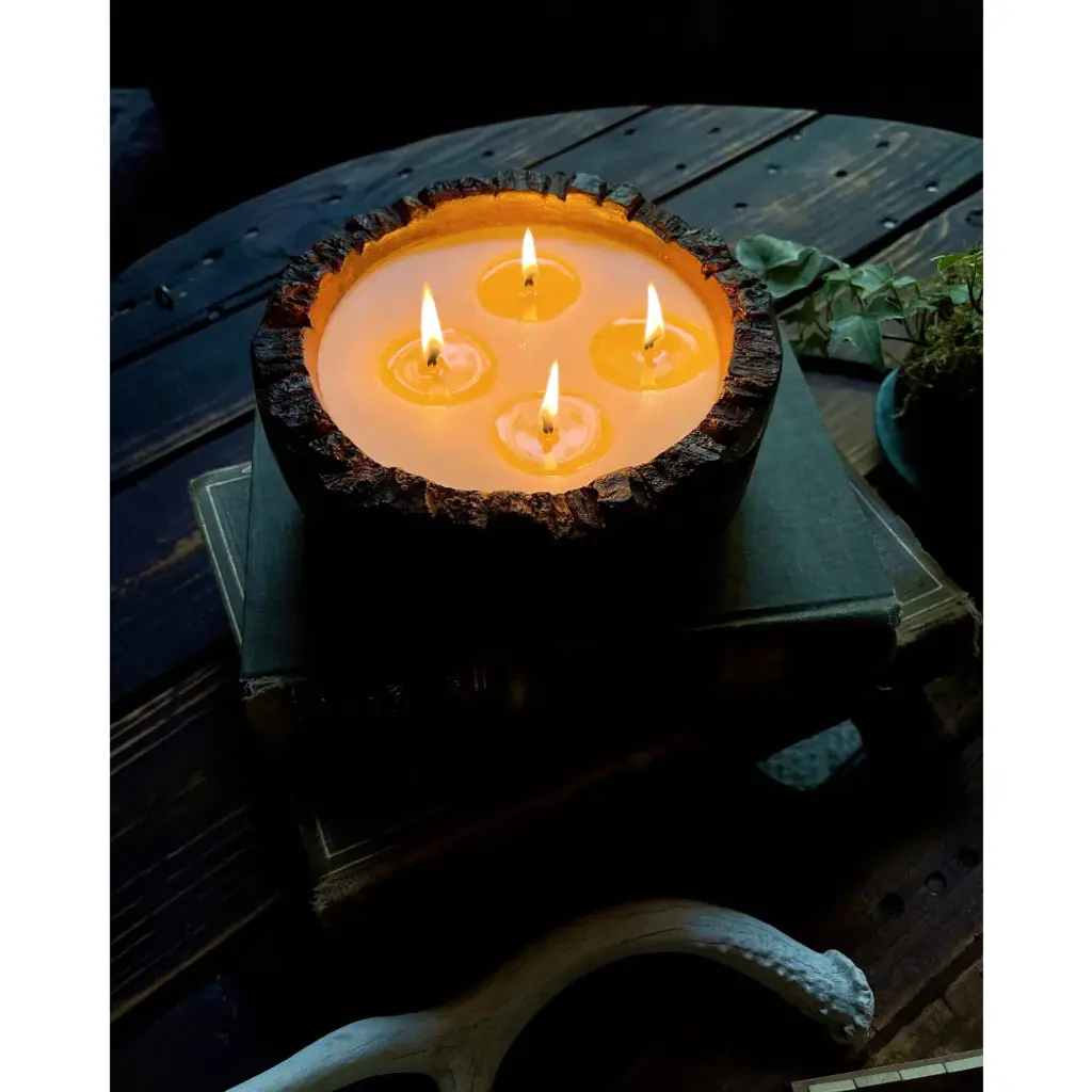 Made from renewable mango wood with reclaimed tree bark, this candle is hand poured in a chunky wood bowl. Elevating the outdoors and bringing it inside. Available in various scents. Reusable as a decor piece after burn is complete.