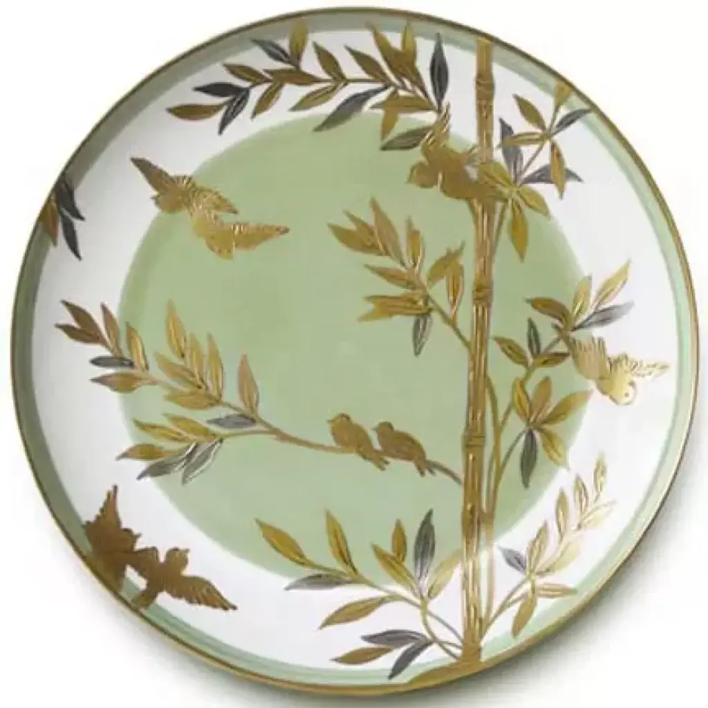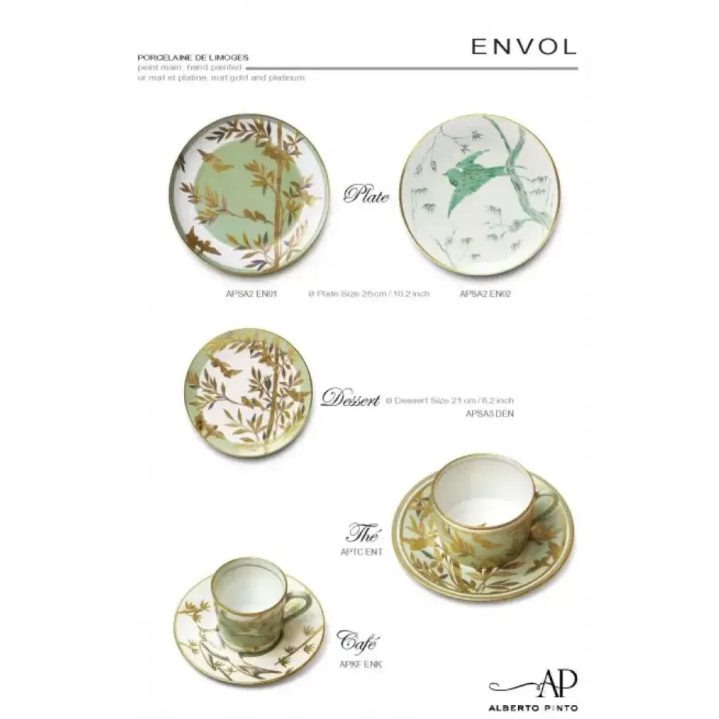 Subtle bamboo leaves and charming birds trim the Envol dinnerware set. With gold and platinum details. Designed by Alberto Pinto, these whimsical birds will bring a sweet song to your dinner table. Five piece place setting includes dinner plate (green center), dessert plate, bread & butter plate, tea cup and saucer. One of France’s best-known interior designers, Alberto Pinto has designed not only homes but also yachts, private jets, luxury hotels, and restaurants. His work has been called the "haute couture of interior decorating." His prolific creations range in style from modern to classical to Asian-inspired and floral themes, and all of them are executed superbly on Limoges porcelain to create art for your table.