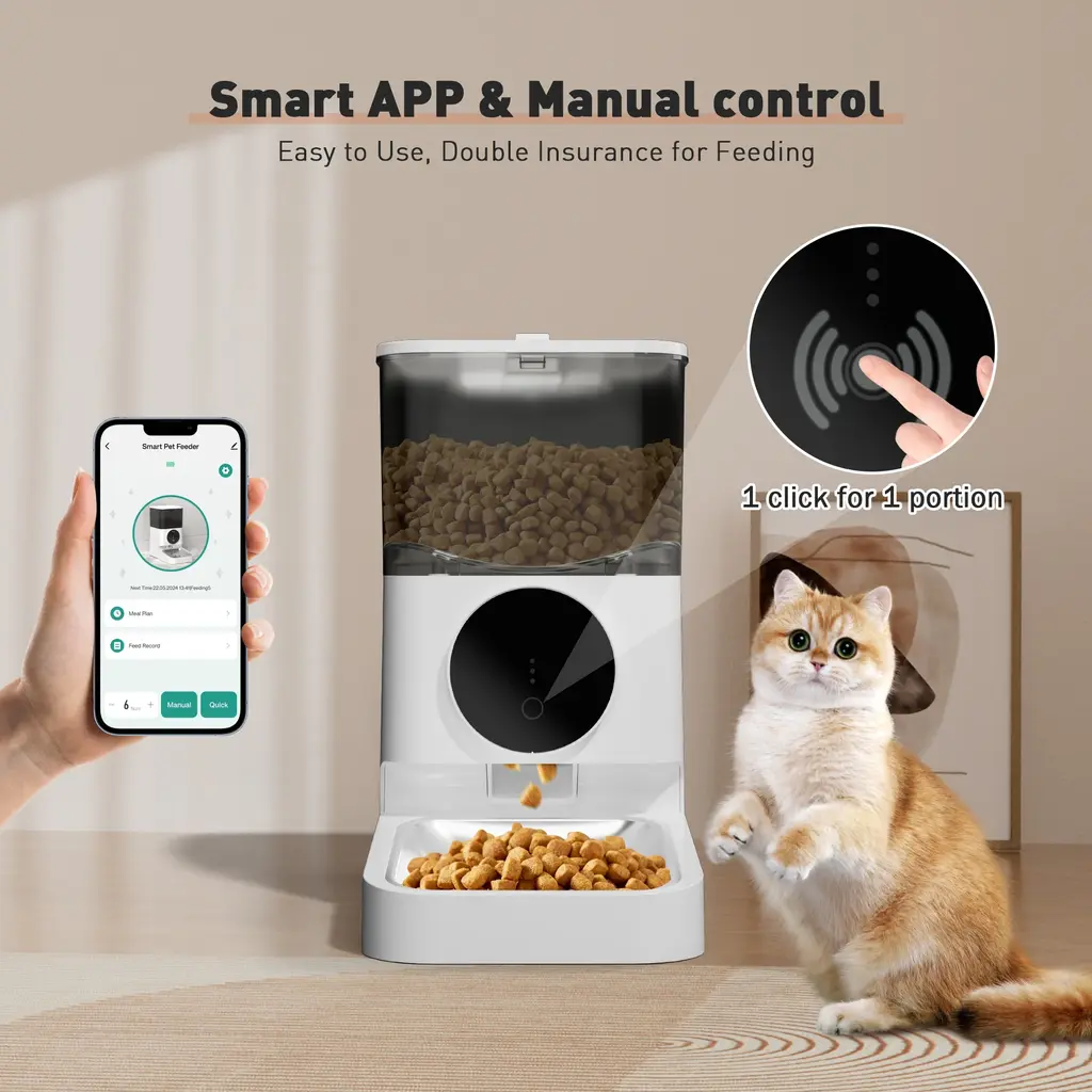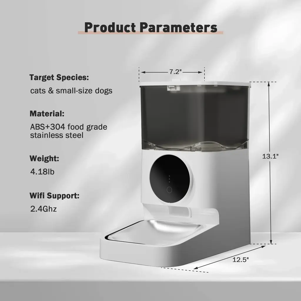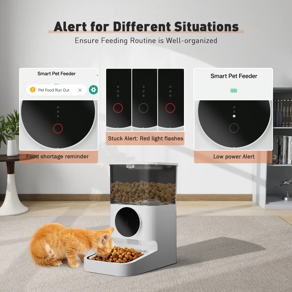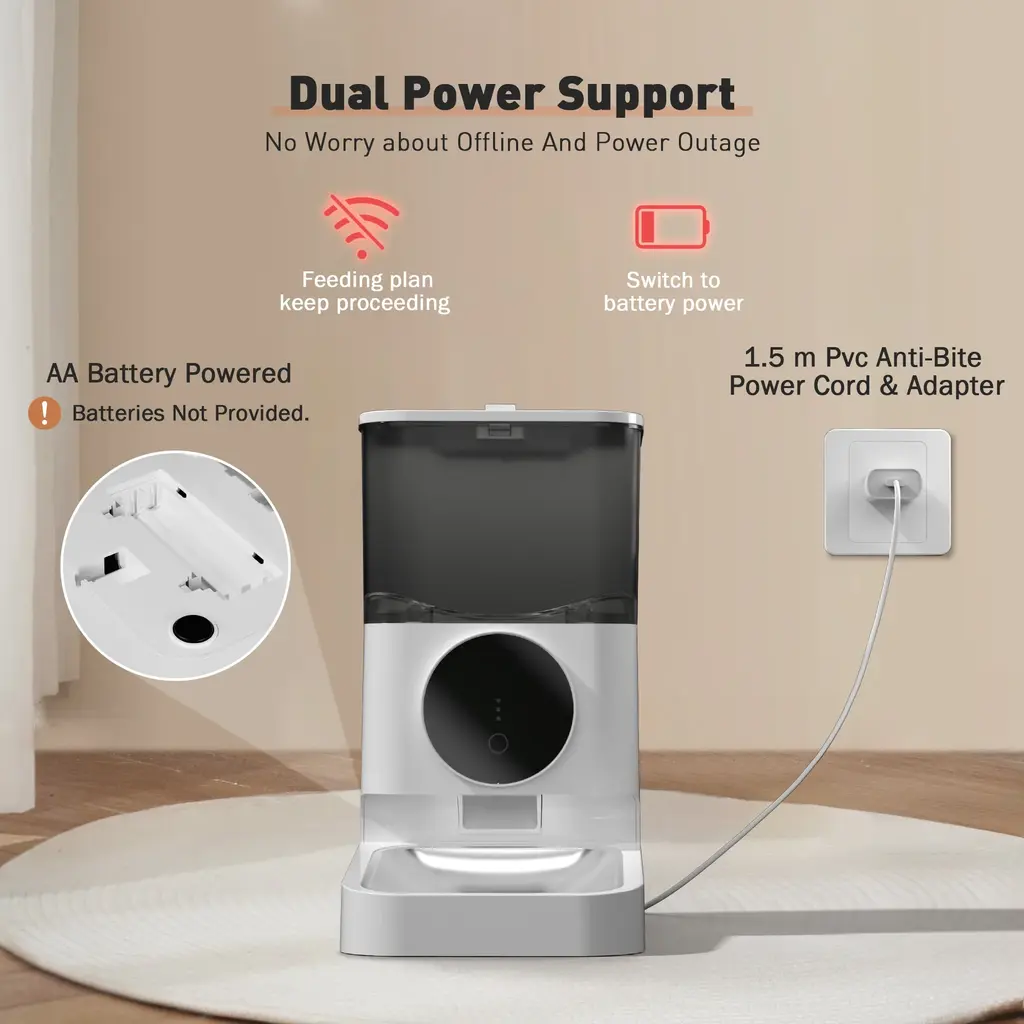 【APP and Manual Operation】 Control the automatic pet feeder via a dedicated mobile app or manual buttons. Adjust feeding settings remotely or directly for convenience whether you're home or away. 【Customizable Feeding Schedule】 Set specific meal quantities, portion sizes, and feeding times with the built-in feeding plan feature to ensure regular and appropriate feeding for your pet. 【Dual Power Supply】 Powered by a 5V/1A adapter and supports AA battery backup, ensuring the feeder continues to operate during power outages with a memory function to maintain the feeding schedule. 【Easy-to-Clean Design】 Detachable components make it simple to clean and maintain, ensuring a hygienic eating environment for your pets. Note: The main body is wipe-clean only. 【Feeding Alerts for Unusual Situations】 Receive app notifications and alerts for low food levels, food jams, and low battery status. Indicator lights on the feeder provide visual alerts for these conditions.