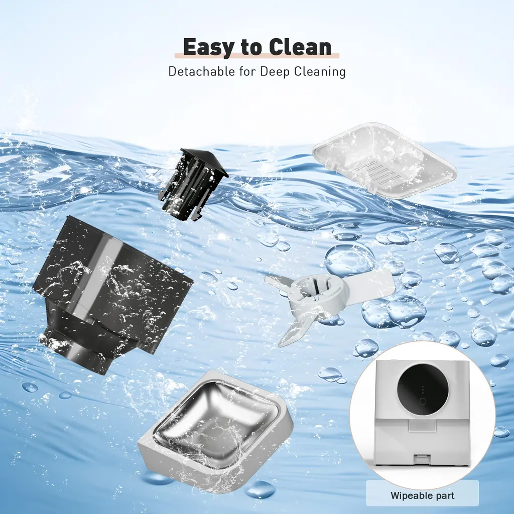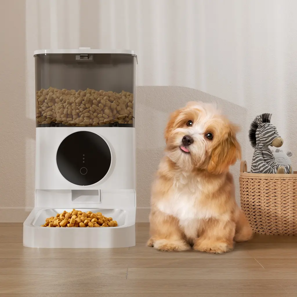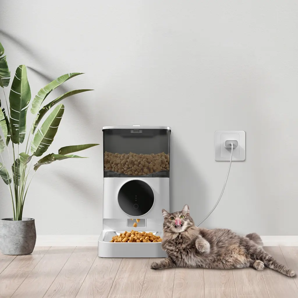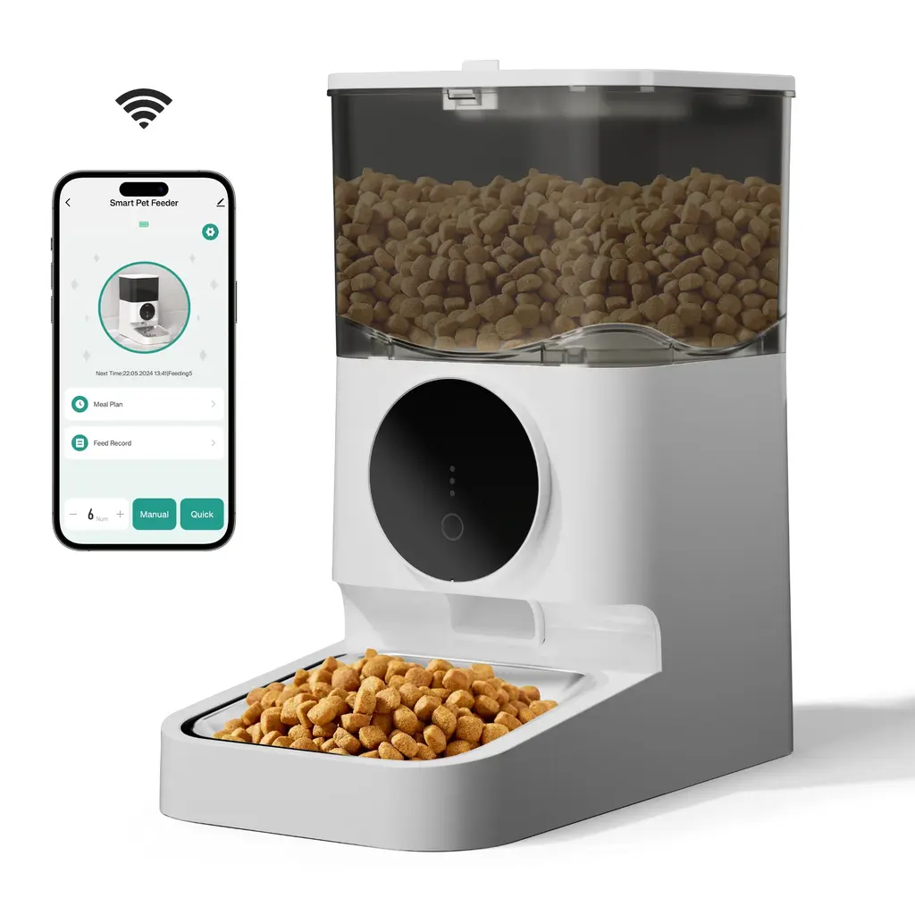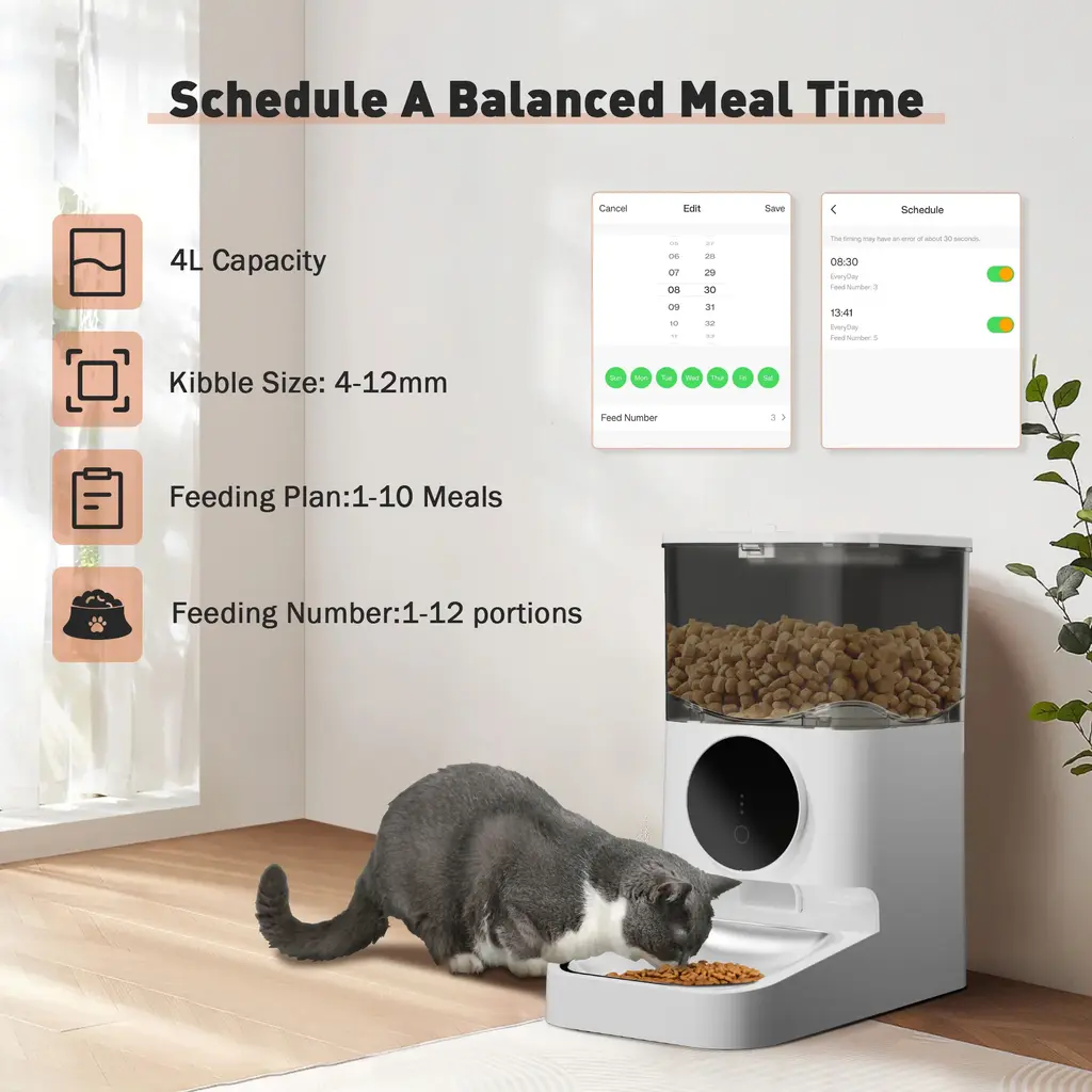 【APP and Manual Operation】 Control the automatic pet feeder via a dedicated mobile app or manual buttons. Adjust feeding settings remotely or directly for convenience whether you're home or away. 【Customizable Feeding Schedule】 Set specific meal quantities, portion sizes, and feeding times with the built-in feeding plan feature to ensure regular and appropriate feeding for your pet. 【Dual Power Supply】 Powered by a 5V/1A adapter and supports AA battery backup, ensuring the feeder continues to operate during power outages with a memory function to maintain the feeding schedule. 【Easy-to-Clean Design】 Detachable components make it simple to clean and maintain, ensuring a hygienic eating environment for your pets. Note: The main body is wipe-clean only. 【Feeding Alerts for Unusual Situations】 Receive app notifications and alerts for low food levels, food jams, and low battery status. Indicator lights on the feeder provide visual alerts for these conditions.