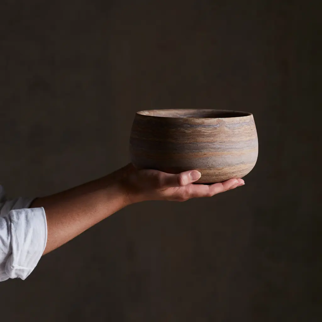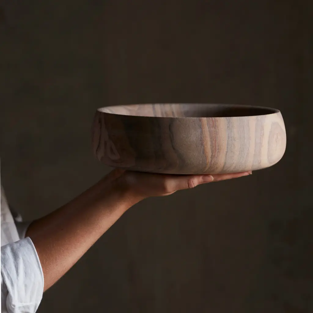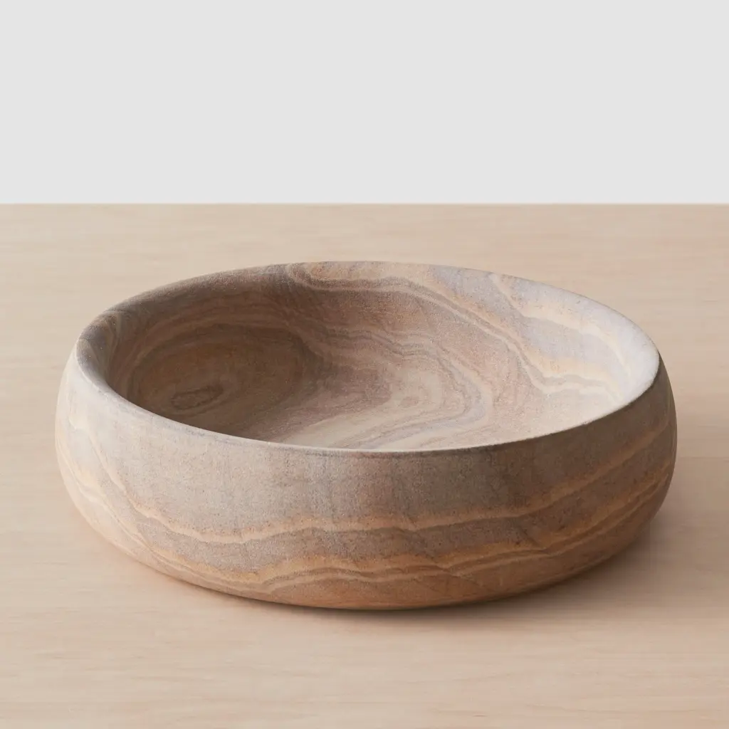 Unique marbling. Matte finish. Elevate your space with this modern sandstone bowl. Rich, organic hues are the centerpiece of this refined bowl, crafted from natural sandstone. A warm, sculptural addition to any home, each piece combines clean lines with distinctive shades of red, violet, and brown veining for a look that can’t be missed. Handcrafted from locally-sourced rainbow sandstone from the mountains of India, each piece can take several days to make. From the first cut to the final polish, artisans bring their generations of experience to reveal the unique character of each piece. All made start to finish in a fair trade environment in Agra, India. Note: Due to the porous nature of sandstone, water marks may be apparent over time and recommended for decorative use only. See care instructions and wipe dry after use.