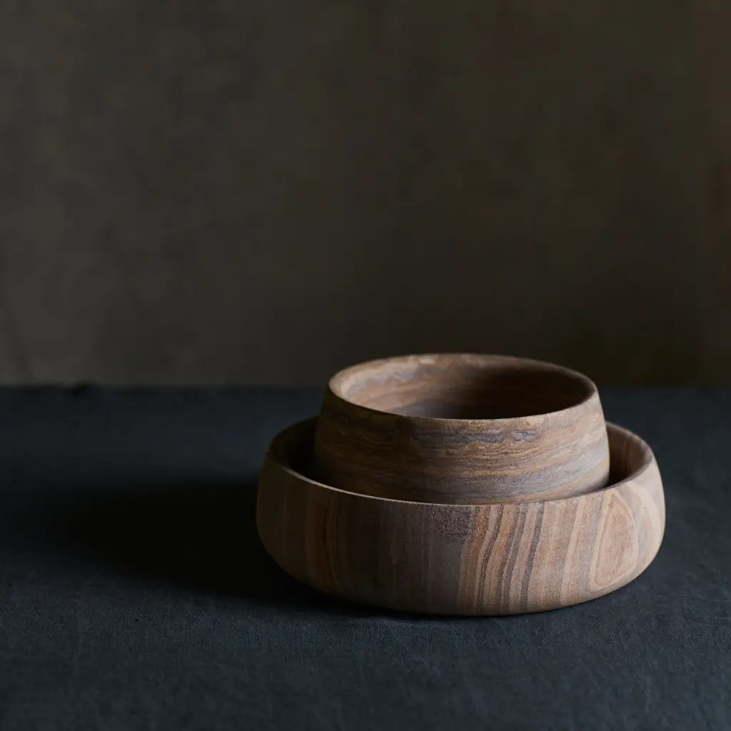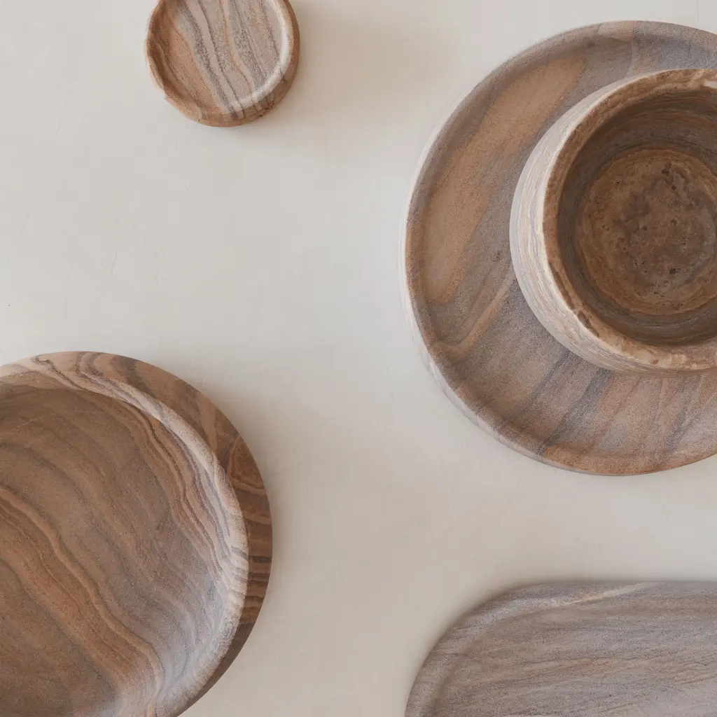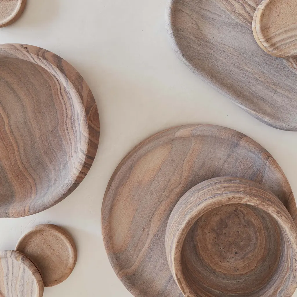 Unique marbling. Matte finish. Elevate your space with this modern sandstone bowl. Rich, organic hues are the centerpiece of this refined bowl, crafted from natural sandstone. A warm, sculptural addition to any home, each piece combines clean lines with distinctive shades of red, violet, and brown veining for a look that can’t be missed. Handcrafted from locally-sourced rainbow sandstone from the mountains of India, each piece can take several days to make. From the first cut to the final polish, artisans bring their generations of experience to reveal the unique character of each piece. All made start to finish in a fair trade environment in Agra, India. Note: Due to the porous nature of sandstone, water marks may be apparent over time and recommended for decorative use only. See care instructions and wipe dry after use.
