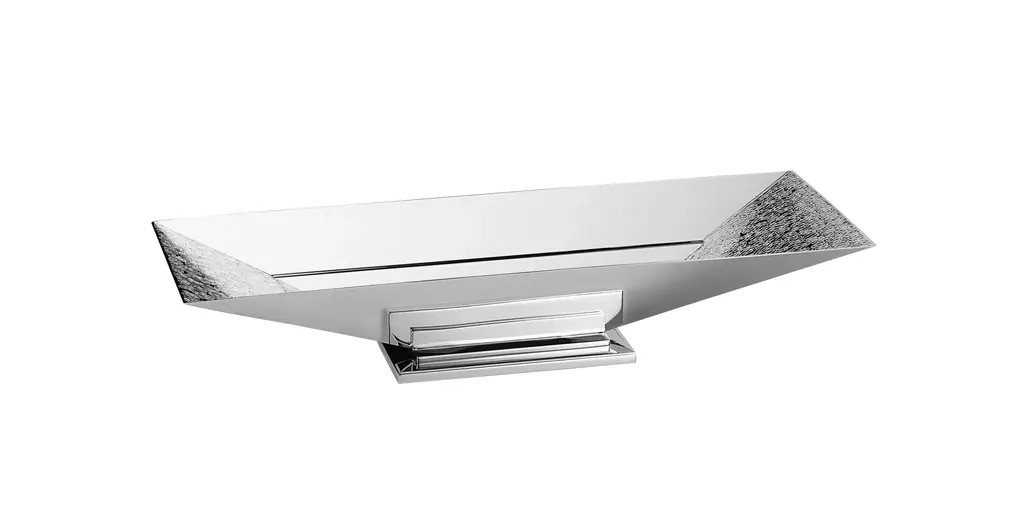 This bowl is made of glossy silver alloy with the RETTANGOLI texture.