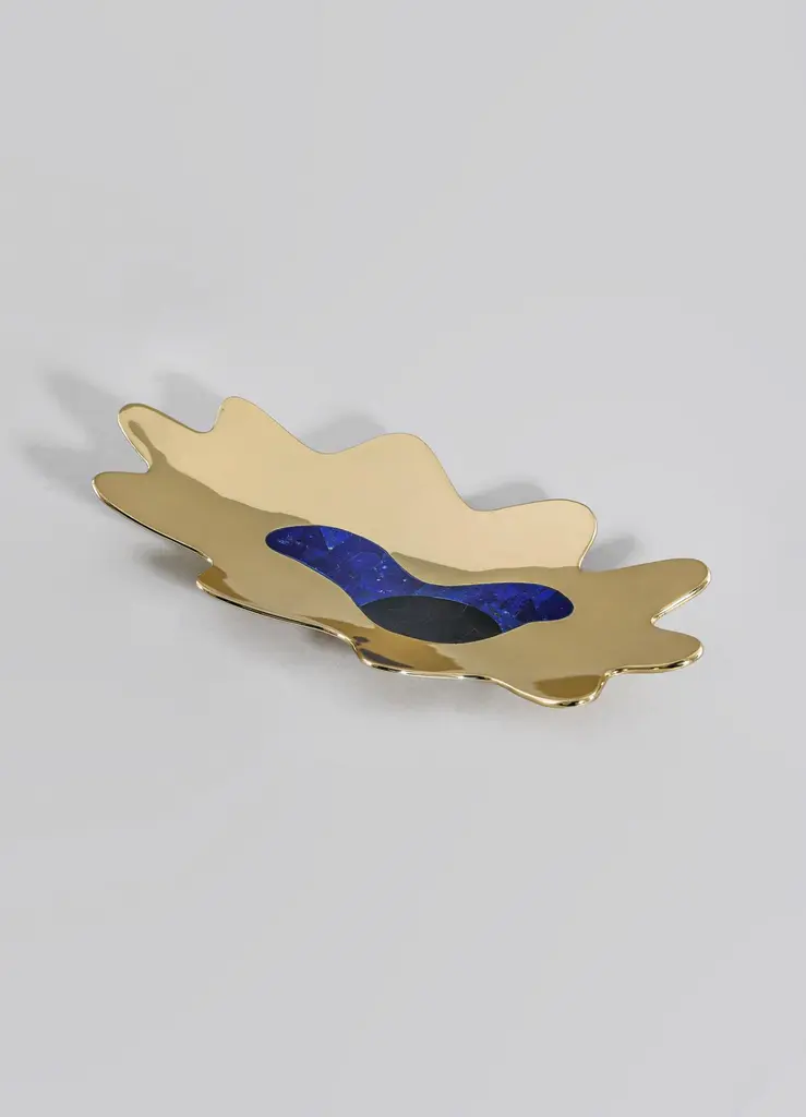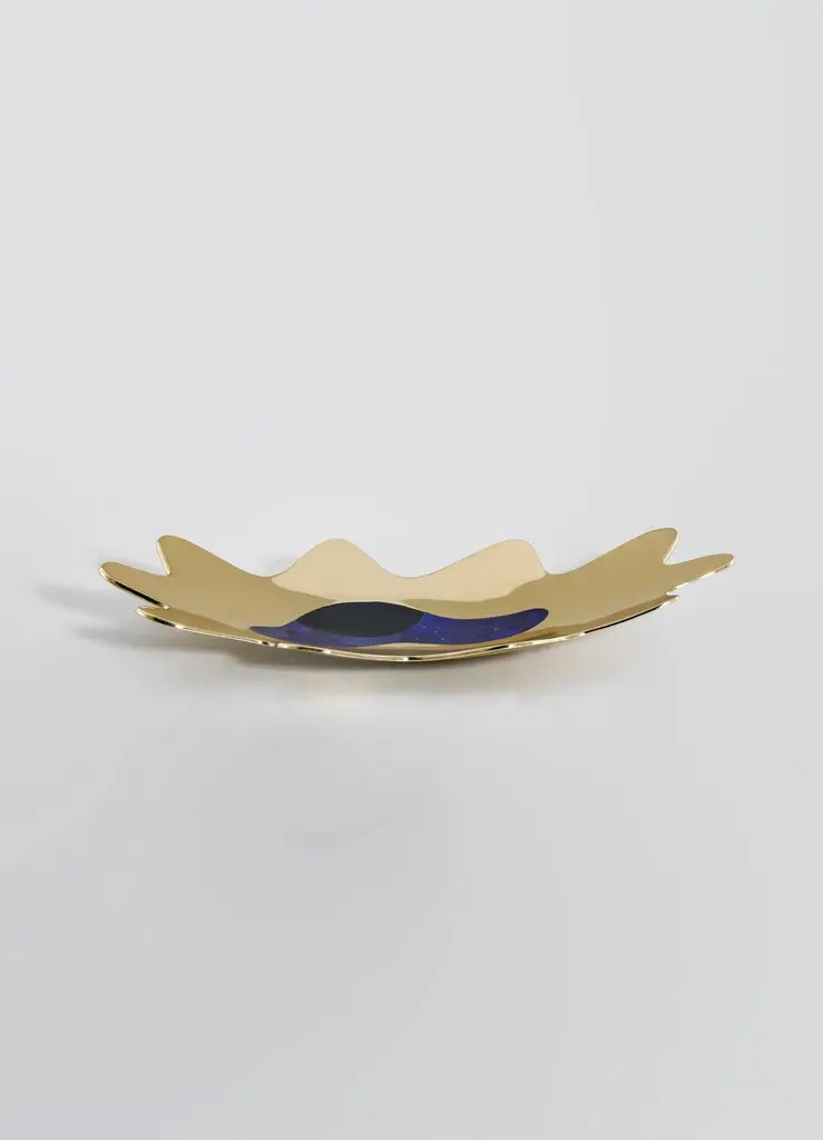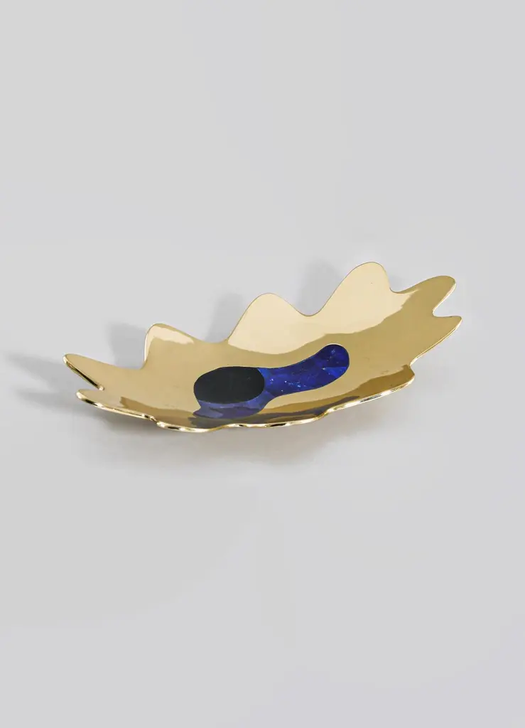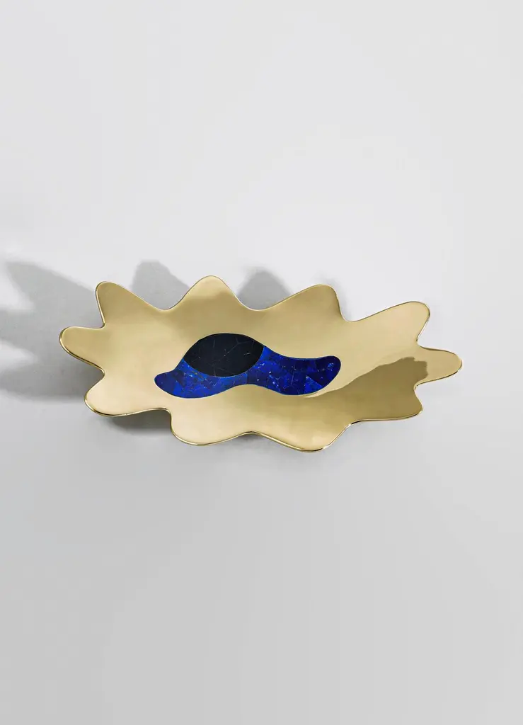 Evil Eye Bowl Large in Brass with Semi Precious Stone, Viya by Vikram GoyalThe collection reimagines a protective totem for your home; negative energy knows it is not welcome here. From Kashmir to Kanyakumari, the Nazar amulet has cast a watchful eye against evil forces for centuries. This talismanic amulet takes on many forms, from hanging lemon and chilli, a spirited face, or as an eye itself. Bring it home and watch it stand guard.Bowl in brass with semi precious inserts. Handmade in India.Product DetailsMaterial: BrassInlay: Lapiz Lazuli , Black PortoroSize: 20"L x 9"W x 2.5"H 50.8 L x 22.9 W x 6.3 H cmWeight: 2.3 kg 5.06 lbsNumber of Pieces: 1 BowlSKU: VPT153This product has been handcrafted by local artisans. As such, slight variations are a testament to the unique character of a piece made by hand.