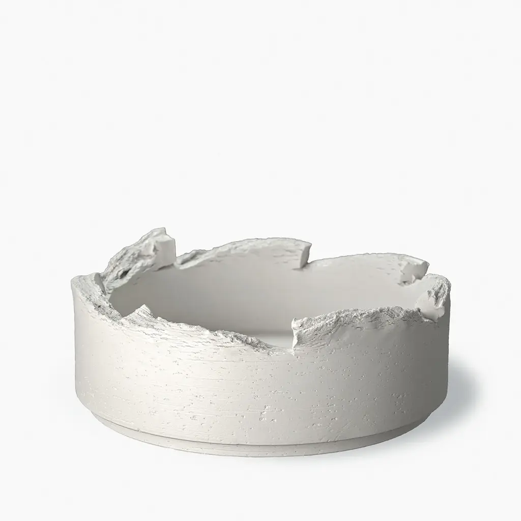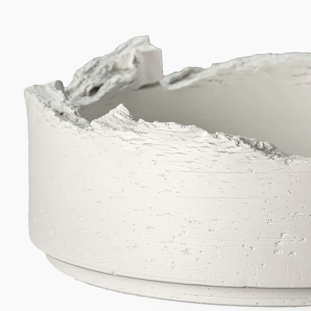 Matching contemporary taste for unadorned elegance, this cylindrical bowl by duo Formafantasma in matte white ceramic was showcased at the 2019 Milan Design. Its seemingly simple profile appears tapered at the base, a detail counterbalancing the captivating, willingly torn appearance of the bowl's rim.
