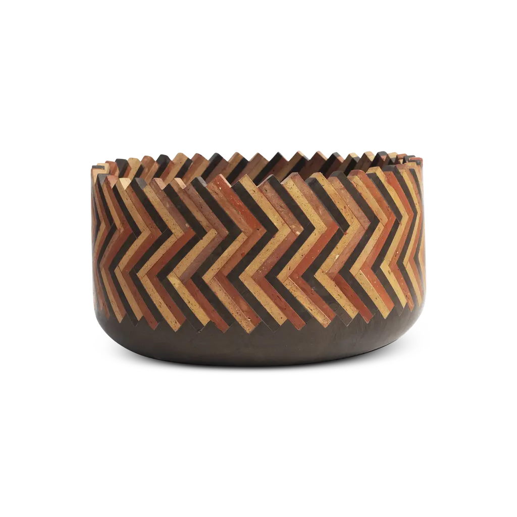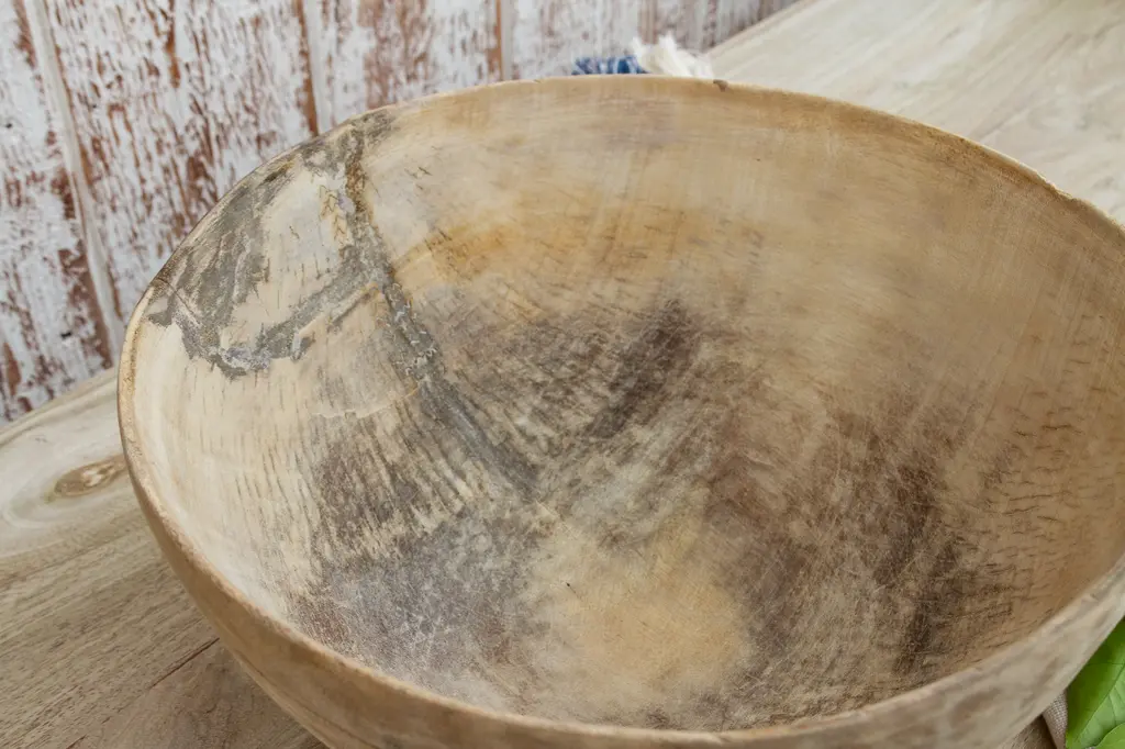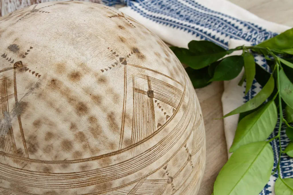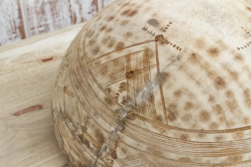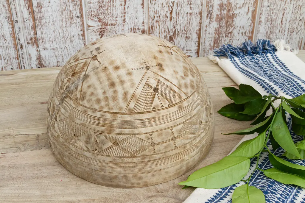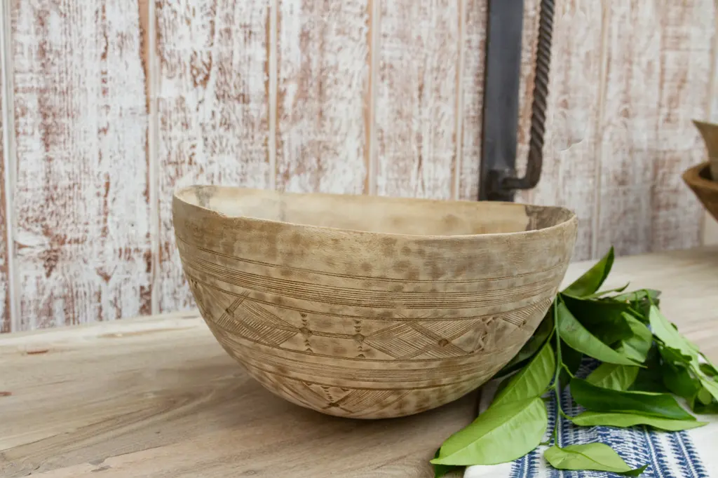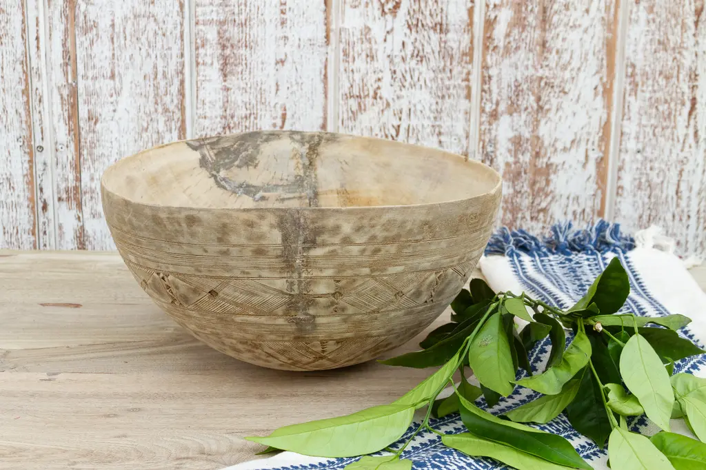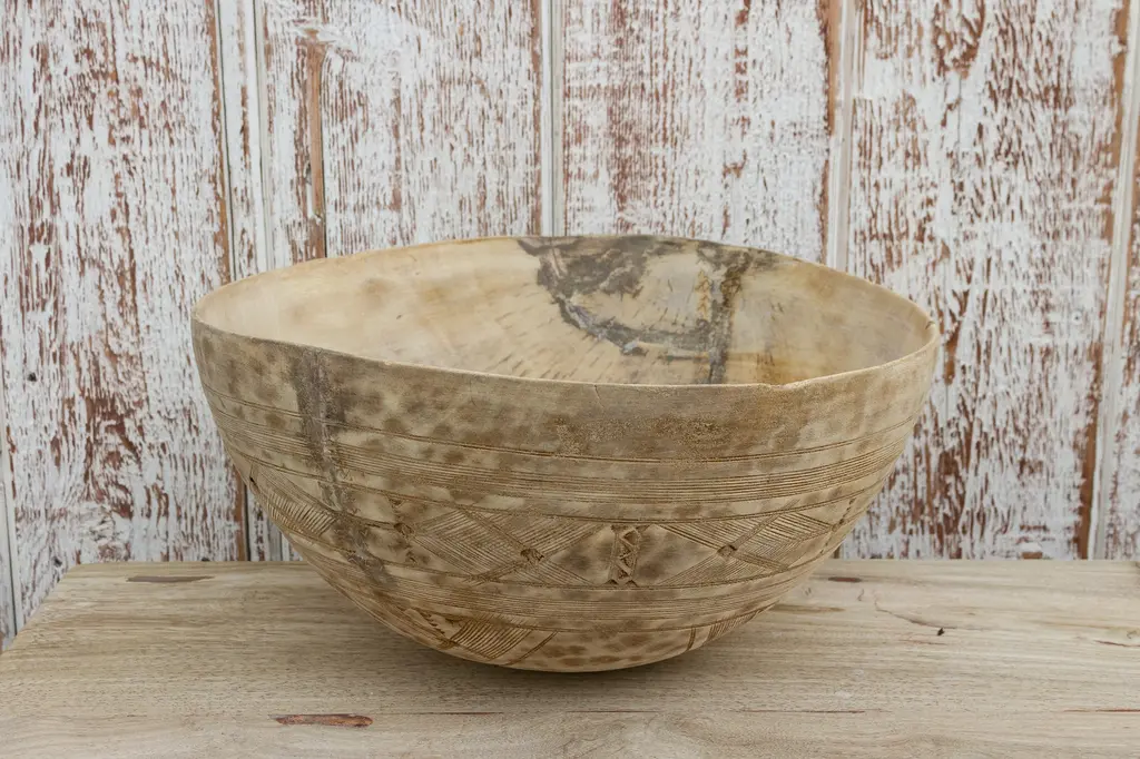 Hand-carved from single logs of indigenous hardwood in West Africa. The Tuareg community are a nomadic group traveling across the Saharan desert. Each bowl is unique featuring a fine decorative engraving with geometric lines or tribal design. These beautiful African bowls have a deep rounded shape and then have been used to transport and store milk and food. These bowls are authentic and will show wear, possible cracks.
