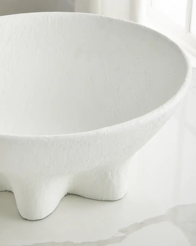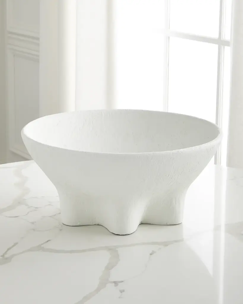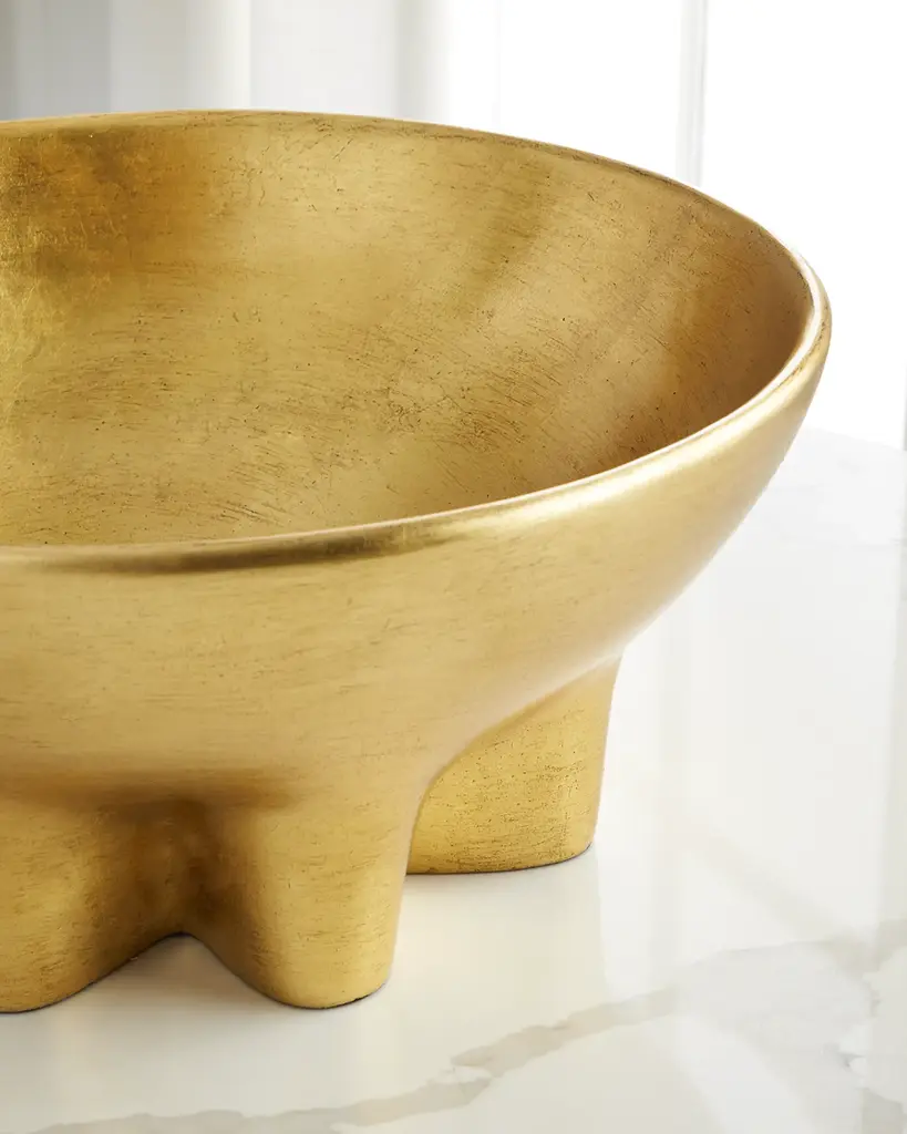 This decorative bowl with its uniquely shaped base will add visual interest wherever it is placed. This bowl comes in two beautiful finishes- white gesso or gold leaf.