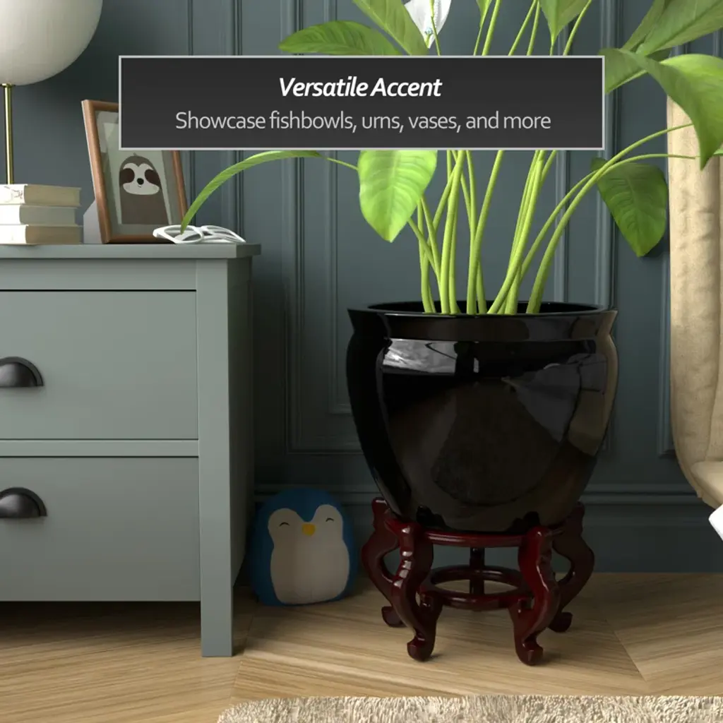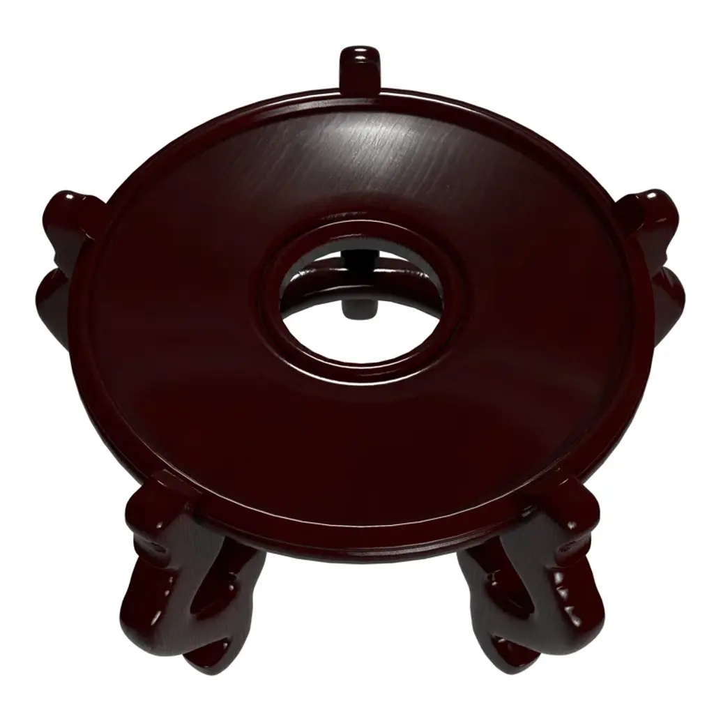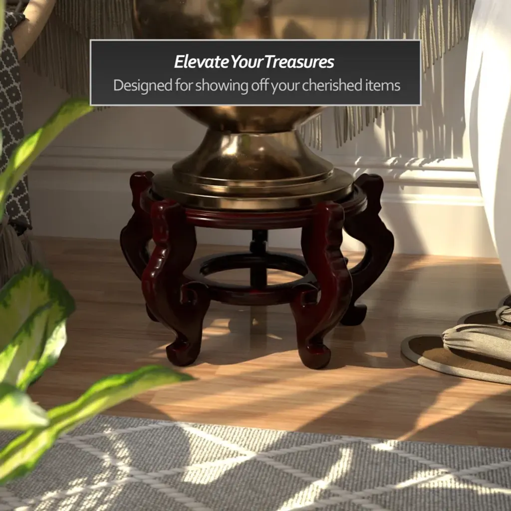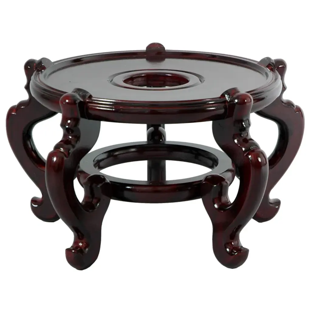 This wood vase stand offers a vintage-inspired way to elevate your home decor. Crafted from paulownia mahogany wood and hand-painted in a deep mahogany hue, it features detailed carvings that add a touch of elegance. Its five-leg design, reinforced by a center ring, provides stable support for your vases or urns. Handcrafted with care, this stand is ready to use immediately. Whether in the living room or entryway, it adds a refined touch to your space.