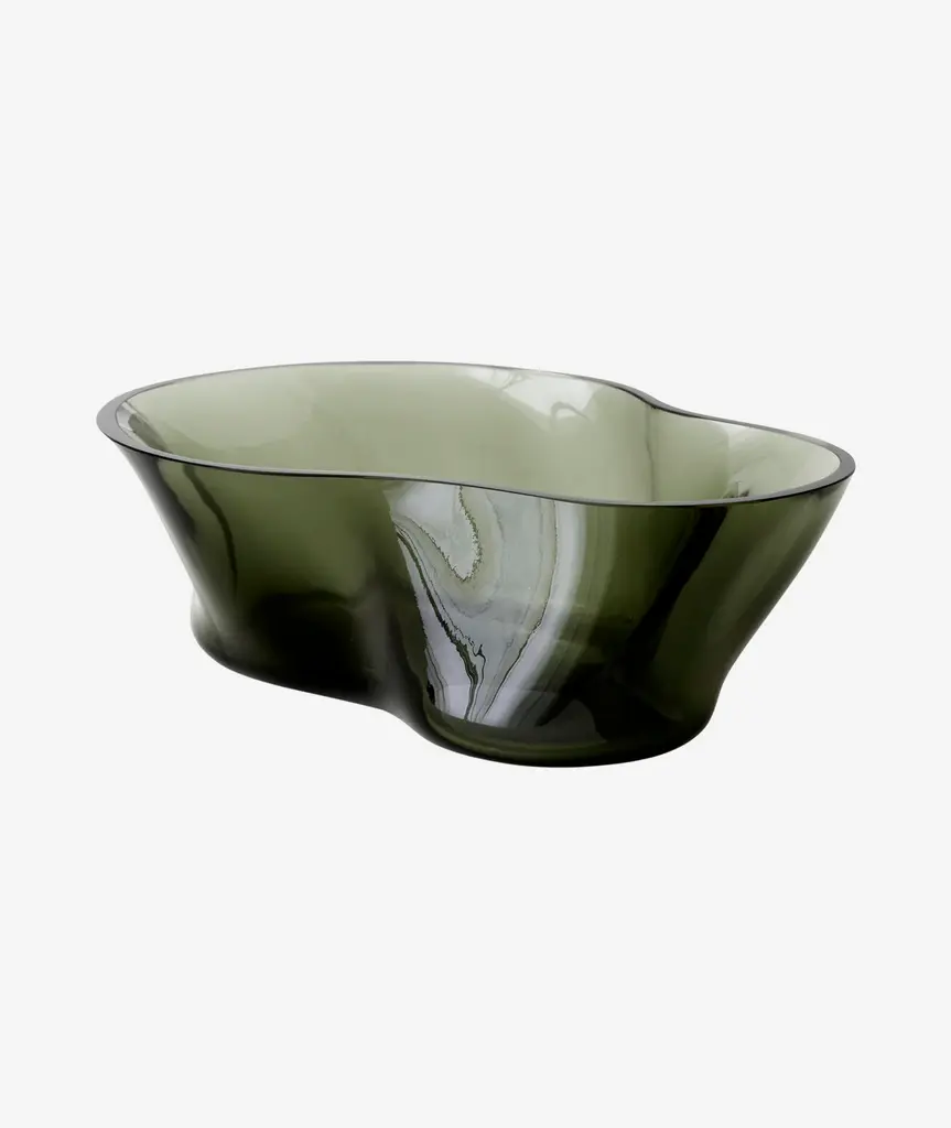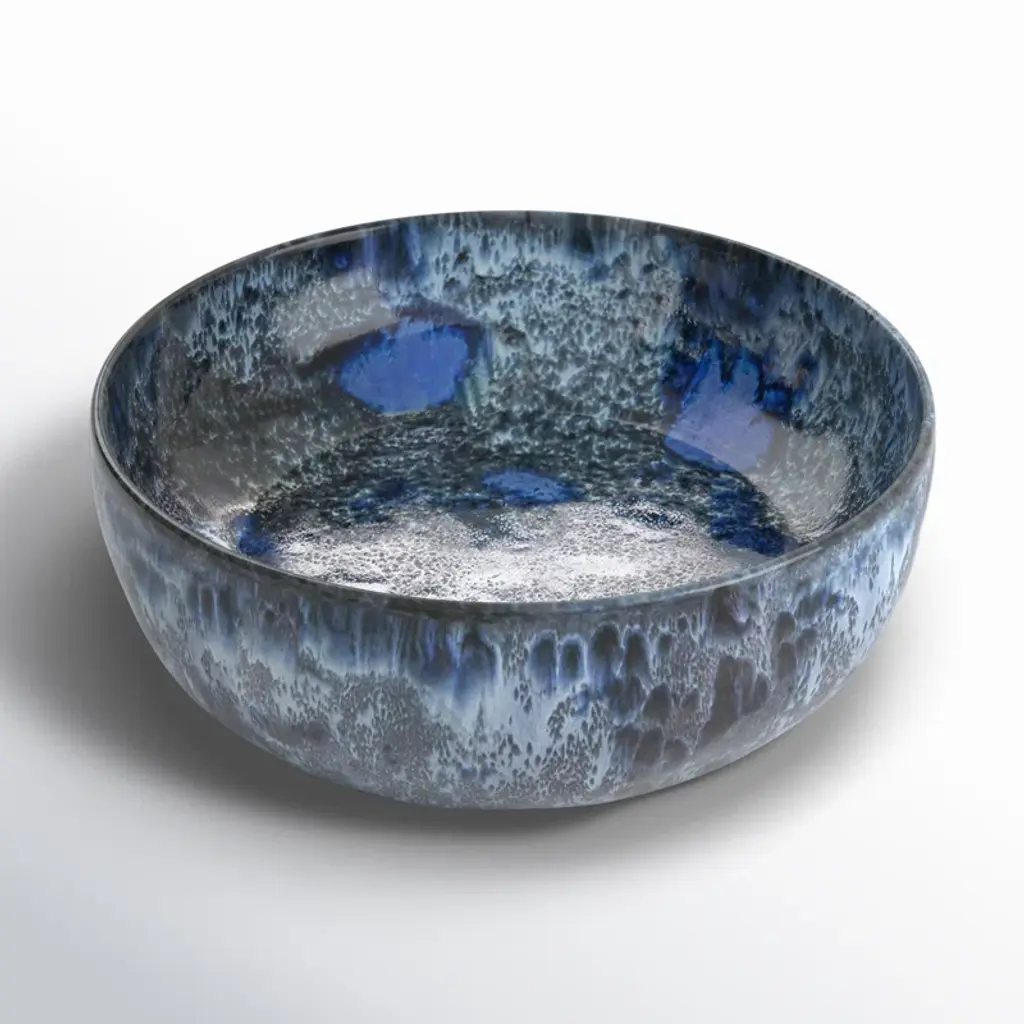 8.25"H X 22.75"D The curving rim adds interest to this elegant bowl displaying a variegated teal reactive glaze. Disclaimer: Due to glazing process, variations in pattern and color will occur. No two will be identical.