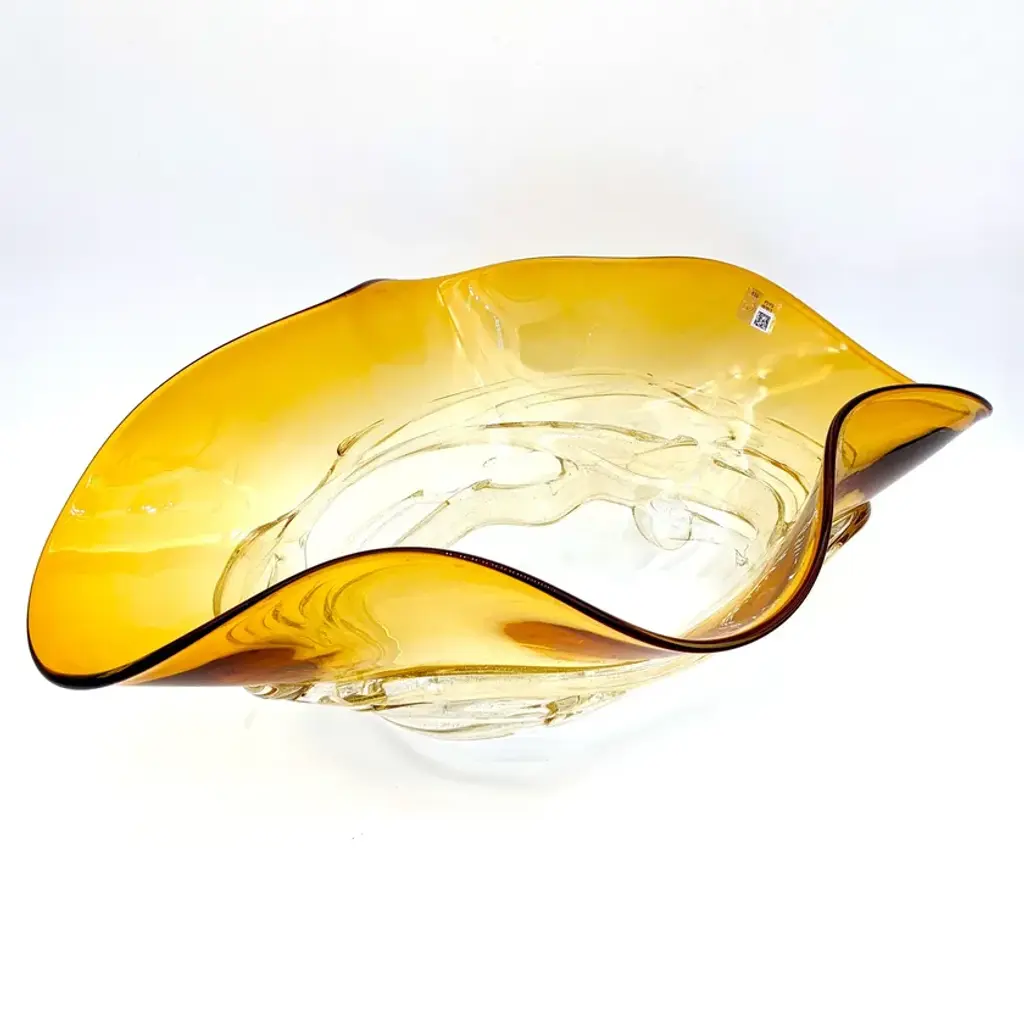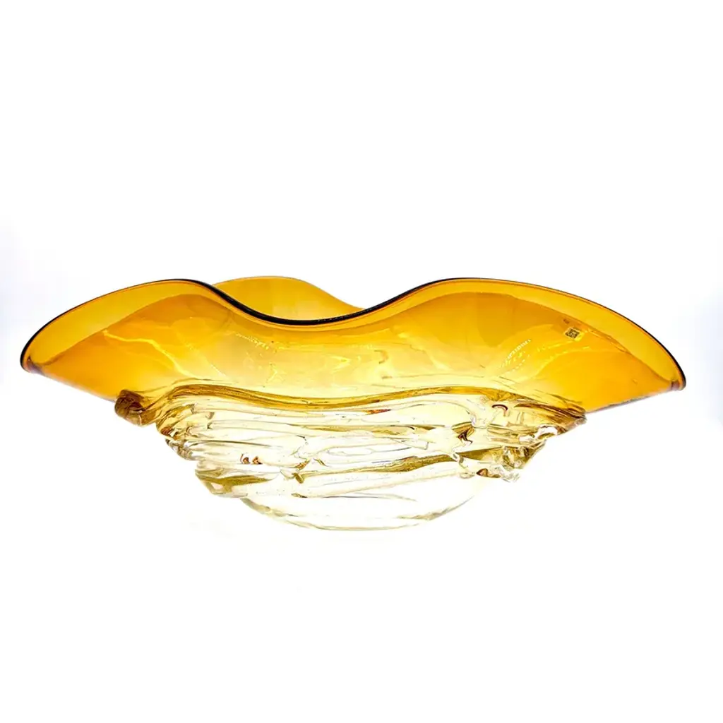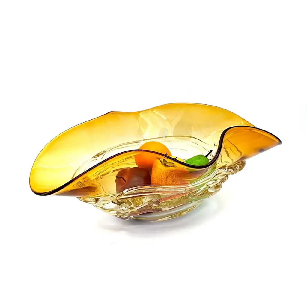 FLOUNDER is a charming amber-colored centerpiece in Murano glass with crystal details and gold leaf. Suitable for both classic and modern design. These hand-blown Murano glass centerpieces are enriched with fascinating multicolored filaments that resemble seaweed in shades of amber, blue, and red. The design, inspired by an elegant oyster, adds a touch of sophistication to any living room or kitchen. Ideal for illuminating the entrance or coffee table, capturing the attention and admiration of guests. These glass centerpieces can be a precious gift for special occasions such as weddings or anniversaries. Their versatility makes them suitable for any setting, and their artisanal craftsmanship by Murano glassmakers makes them an authentic emblem of Made in Italy, bringing beauty and simplicity into your home. All our products are artisanal and of the highest production quality. Non-substantial variations in shape, size, color, and/or small imperfections are inevitable and are typical of manual glasswork, distinguishing the artisanal craftsmanship.